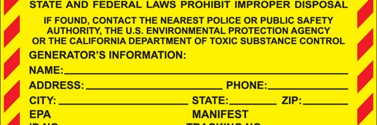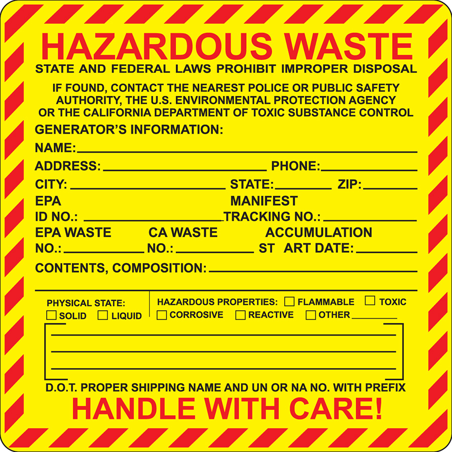 All hazardous wastes stored at the facility must be labelled with the yellow hazardous waste sticker. Ensure that the contents of the sticker are filled out accurately. The most common mistake is not putting an accumulation start date. - No EPA Identification Number