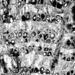 The above image is a cross section of a carbonized yucca flowering stalk. This species is often found in grasslands in areas where there are rarely trees or shrubs. Prehistoric people living in these areas would collect the dried flowering stalks from these plants in the winter and burn them. Although they are only about an inch thick and three feet tall, there can often be hundreds per acre. The carbonized wood from these stalks has an almost surrealistic appearance.