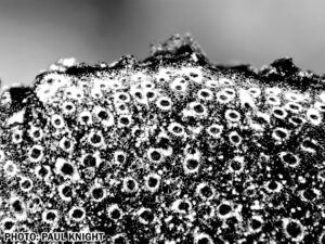 A cross-section of carbonized Gambel’s oak wood showing distinct spherical translucent gummy masses called tyloses that block old wood vessels to prevent infection.
