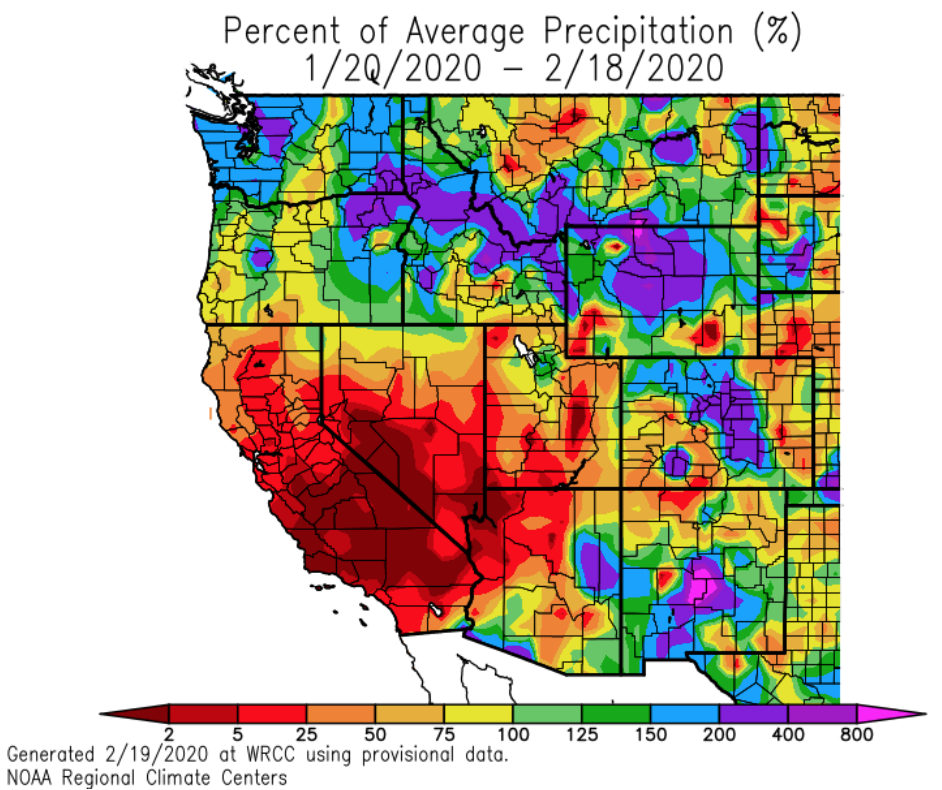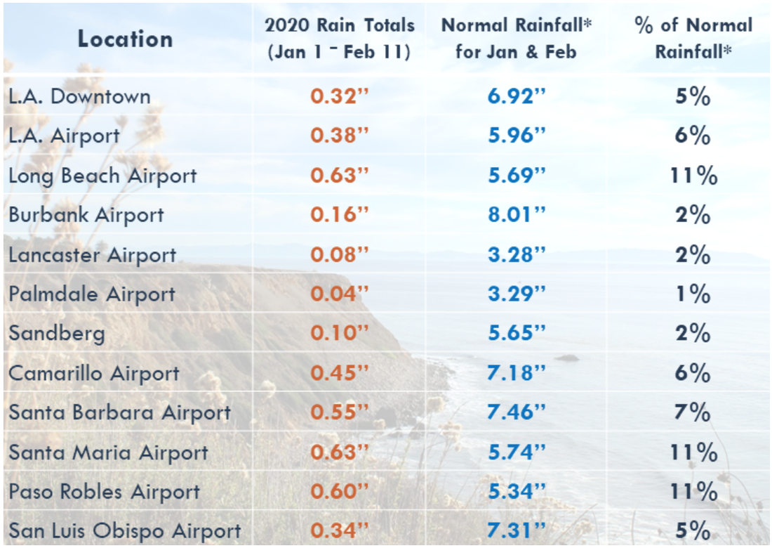 The echoes of people singing “rain, rain, go away, come again another day” during our Thanksgiving and the winter holidays has long faded. Following the wet start to our “rainy season,” 2020 has started out exceptionally dry. Southern California tends to get a significant amount of our winter rain totals during the months of January and February. Without any major storm events expected for the remainder of February, many locations throughout Southern California will be nearing the driest combined January and February on record. As shown in the map below, the percent of average precipitation for the last 30 days shows California and the Southwest are well below average. And the following table prepared by the Los Angeles office of the National Weather Service shows the meager 2020 rainfall totals for stations throughout Southern California.