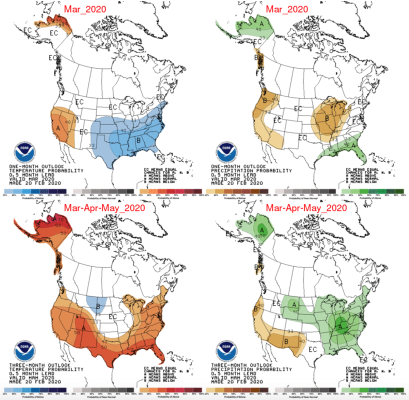 The current long range forecasts don’t indicate an end to the dry start of 2020. The one-month and three month temperature and precipitation outlooks shown below from the National Oceanic and Atmospheric Administration (NOAA) Climate Prediction Center generally favor above-average temperatures and below normal precipitation in California for March and beyond. Mark your calendars, March 1 is the start of meteorological spring!