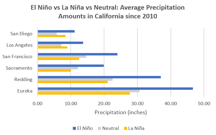 As pivotal components of the El Niño-Southern Oscillation (ENSO) cycle, El Niño and La Niña represent opposing phases, influencing sea surface temperatures and atmospheric conditions. El Niño is characterized by warmer-than-average sea surface temperatures in the central and eastern equatorial Pacific Ocean, with significant impacts on global weather patterns, including increased rainfall in California. Typically associated with wetter conditions in California, El Niño contrasts with La Niña, which is generally linked to drier conditions. The graph below analyzes historical average precipitation data from key regions in California since 2010. Over this period, El Niño has shown a correlation with increased rainfall compared to La Niña and ENSO-neutral winters.