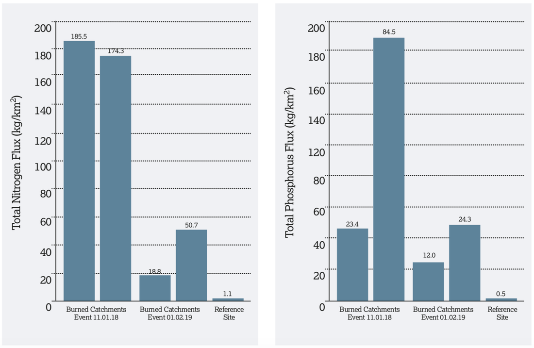 The contaminant flux was calculated as the ratio of the mass loading in kilograms (kg) and the contributing catchment 2) for each storm monitoring event. Mean total phosphorus and total nitrogen flux were estimated to be between 69- and 98-fold higher from burned catchments, and total copper, lead, and zinc flux were estimated to be between 659- and 11,169-fold higher compared to unburned natural areas. Mean total suspended solids flux were estimated to be 27,177-fold higher from burned catchments compared to unburned natural areas. Similar to the pollutant concentrations, the flux from the burned catchments were lower during the second storm event compared to the first flush storm event – indicating the attenuation of contaminant concentrations and loads decreased as the winter storm season continued to experience numerous high- intensity rainfall events.
