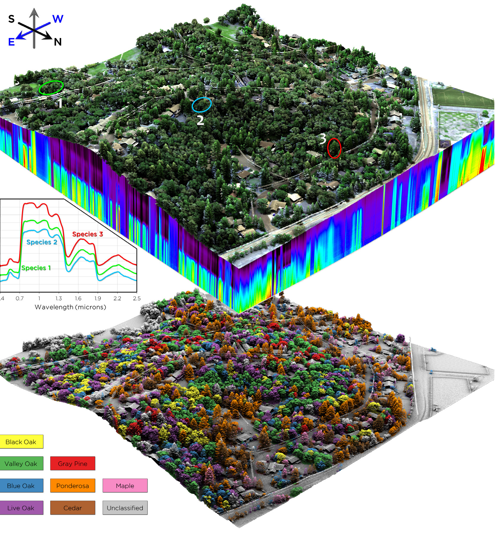 Enhance forest structure modeling, and categorize risk in vegetation management via species identification. NV5 Geospatial is a pioneer in using hyperspectral imaging in combination with lidar to determine tree species.