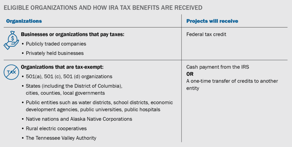 Almost any organization is eligible to receive benefits, assuming the project meets certain qualifications. How entities are compensated for their clean energy projects depends on the type of organization. Taxable entities receive a tax credit. Tax-exempt entities can either receive a cash payment through “Direct Pay” or a one-time “Transfer of Credits.” As an example, a public agency could receive 30 to 50 percent of the cost of its solar project back from the IRS.