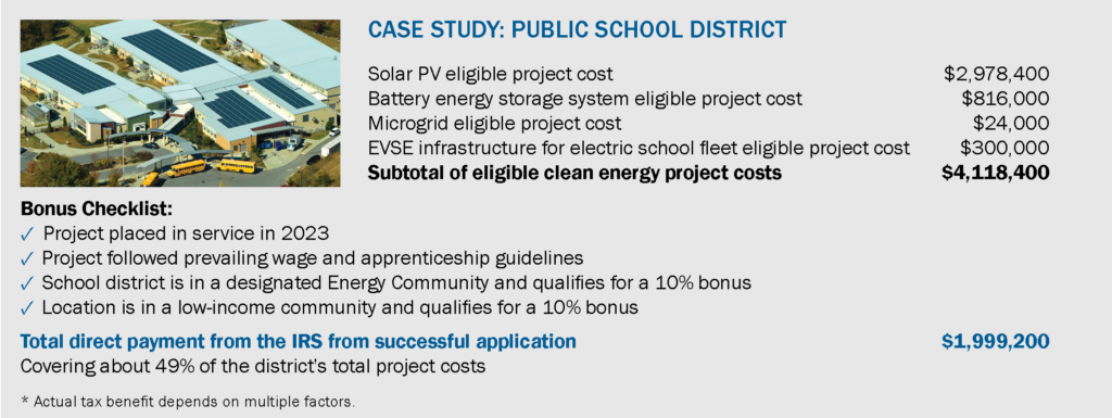 Consider a school district that finished several clean energy projects in 2023. Because the district is in a low-income community that is also an “Energy Community Site,” it qualified for bonus tax credits.