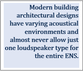NFPA 72 (2019) recognizes the importance of acoustics in analyzing a facility, and states that spaces with dissimilar acoustical characteristics should be treated appropriately to achieve the same level of speech intelligibility. The different areas or acoustically distinguishable spaces (ADS) are defined during the design phase and determined by the AHJ; each space should be designed to meet intelligibility and audible requirements as directed by the AHJ. Modern building architectural designs have varying acoustical environments and almost never allow just one loudspeaker type for the entire ENS. Outdoor public address systems—also sometimes referred to as “giant” or “clear” voice systems—for emergency notification involve various other loudspeaker types distinct from those used inside.