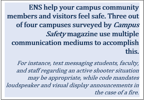 Tragically, campuses need to proactively prepare for unfortunate events and integrate active shooter announcements with their ENS. NFPA 3000, Standard for Active Shooter/Hostile Event Response Program, is a critical reference for mitigating or eliminating risks and impact on campus communities.