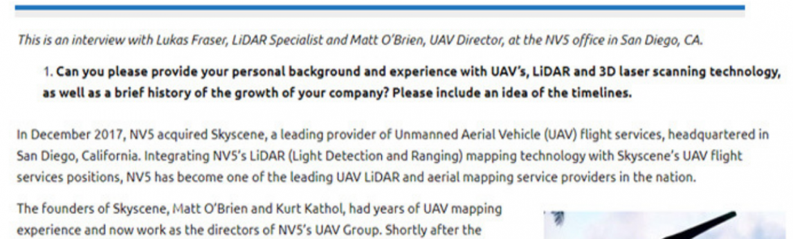 Check out this excellent coverage of NV5’s UAV/LiDAR Mapping services in “LiDAR News.” It features an interview with Matt O’Brien and Lukas Fraser of our San Diego office UAV team. Read it here >>
