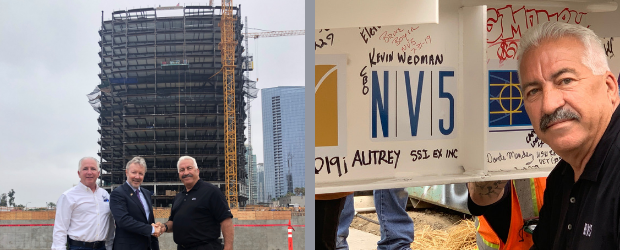 On July 31, 2019, NV5’s Deputy Chief Building Official and onsite inspector, Bruce Boyer, and Senior Vice President for Energy and Chief Building Official, Kevin Wedman participated in the “structural steel topping out ceremony” in which the final piece of structural steel was placed on the 17 story General Administration Facility (GAF). This is an exciting milestone for the project as it nears 50% completion. This age-old tradition gives the construction teams and project stakeholders an opportunity to celebrate their progress and success.
