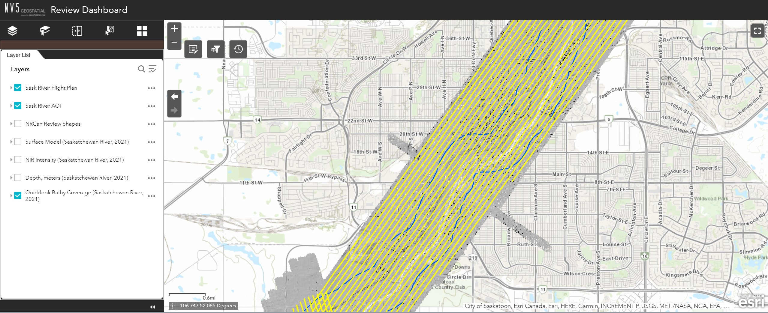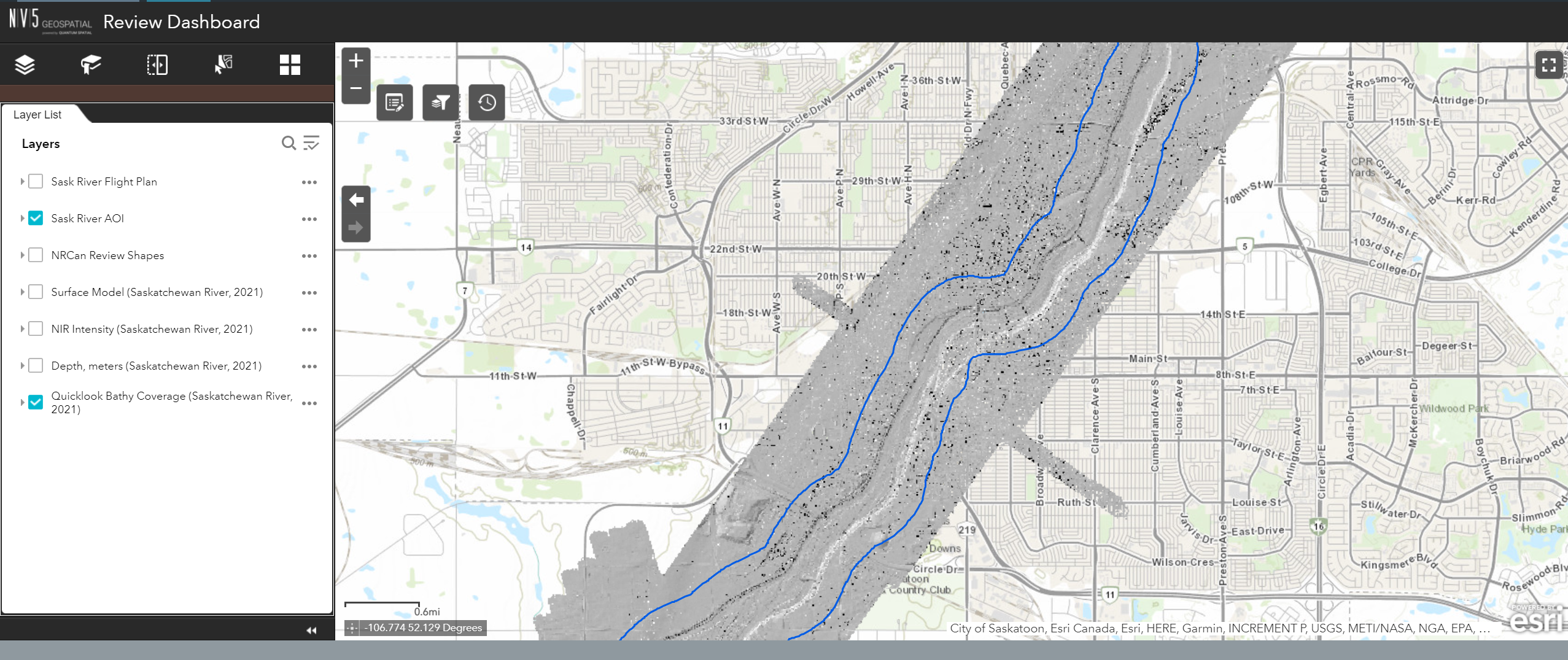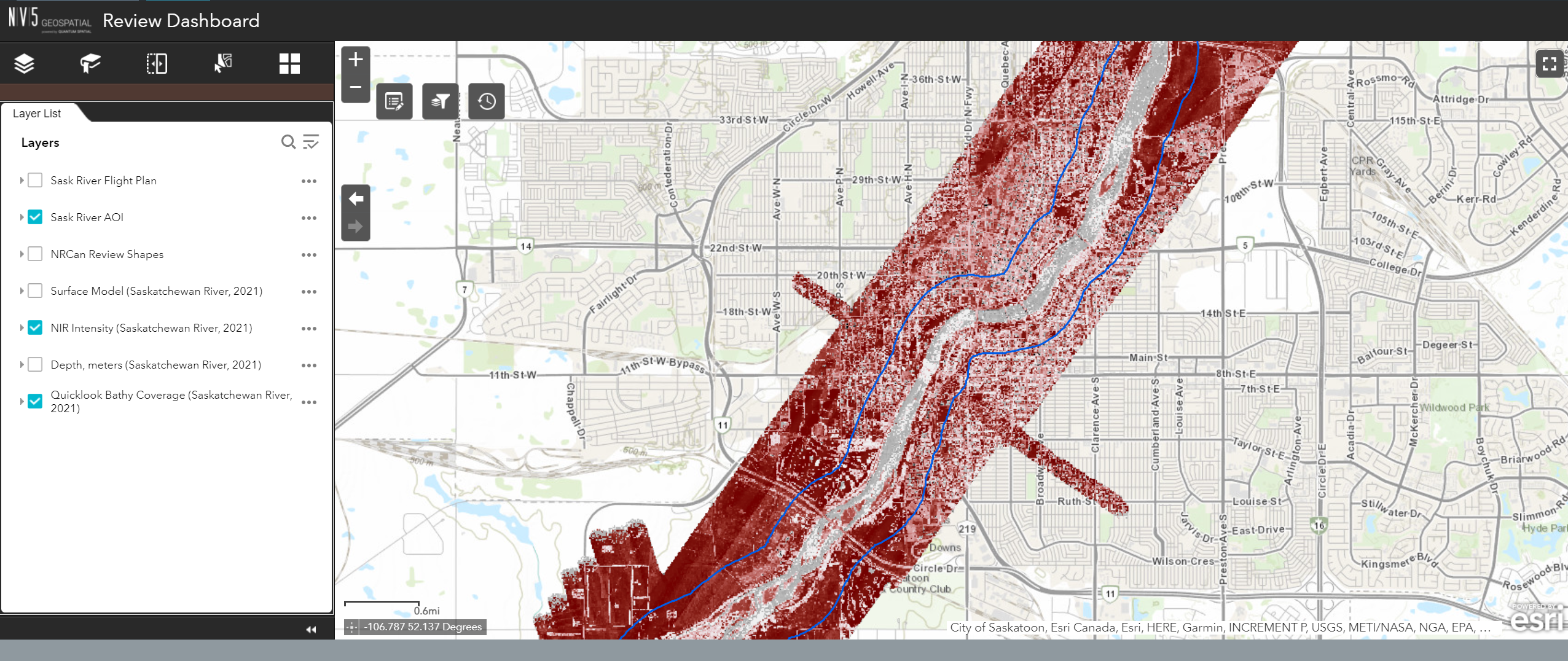 - Natural Resources Canada (NRCan) – The Canadian federal department responsible for natural resources, energy, minerals and metals, forests, earth sciences, mapping and remote sensing, NRCan is working with NV5 Geospatial to collect airborne topobathymetric lidar data over the South Saskatchewan River in the province of Saskatchewan. This data will be used primarily for hydrological and flood mapping analyses. It will also serve as a foundation for a high-resolution digital elevation model of the area and contribute to the National Elevation Data Strategy being implemented through NRCan’s Canadian Centre for Mapping and Earth Observation (CCMEO).