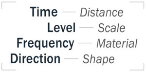 This is not an exact pairing, nor is it an exclusive mapping, as material also relates to level, scale to time and to frequency, etc. It is simply an example of how acoustic design factors begin to be composed by architectural design implications, beyond the common discourse of reflection, absorption, and scattering.