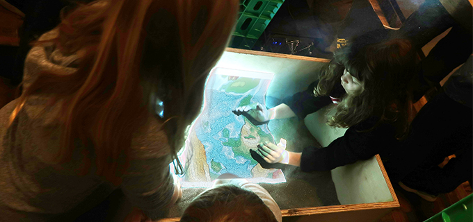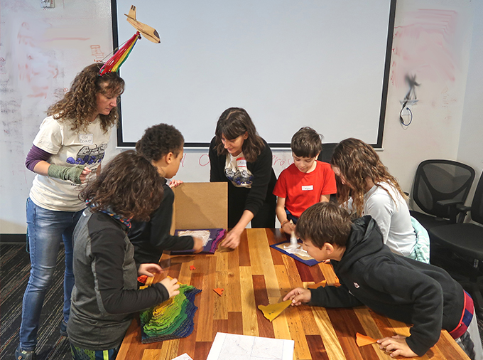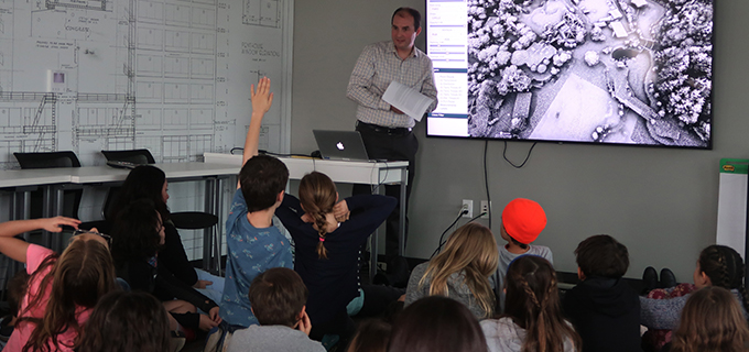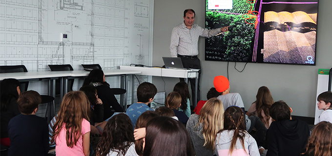 To celebrate National GIS Day 2019, Quantum Spatial’s Portland office hosted a field trip from Ms. Caroline Coholan’s 3rd grade class from Llewellyn Elementary School. The class of 30 students were introduced to the basics of remote sensing and lidar applications before participating in hands-on exercises designed to present the concepts of aerial photography, elevation modeling, and contour mapping. In addition, the students had a first-hand encounter with a remote-sensing robot and an engaging experience with a responsive, topographic sandbox. This marks the fifth consecutive year Ms Caroline’s class has visited Quantum Spatial, and she explains how valuable the field trip is for her class: