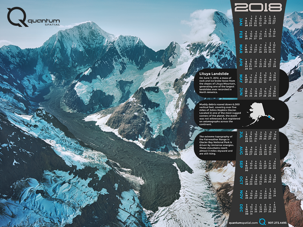 The New Year is right around the corner, which means the Quantum Spatial 2018 calendar is here! We have a downloadable desktop calendar that captures an incredible view of Alaska’s Lituya Landslide. There are two different image sizes to accommodate variation in screen dimensions. Click on the image to begin download. Enjoy, and Happy New Year from everyone at Quantum Spatial!