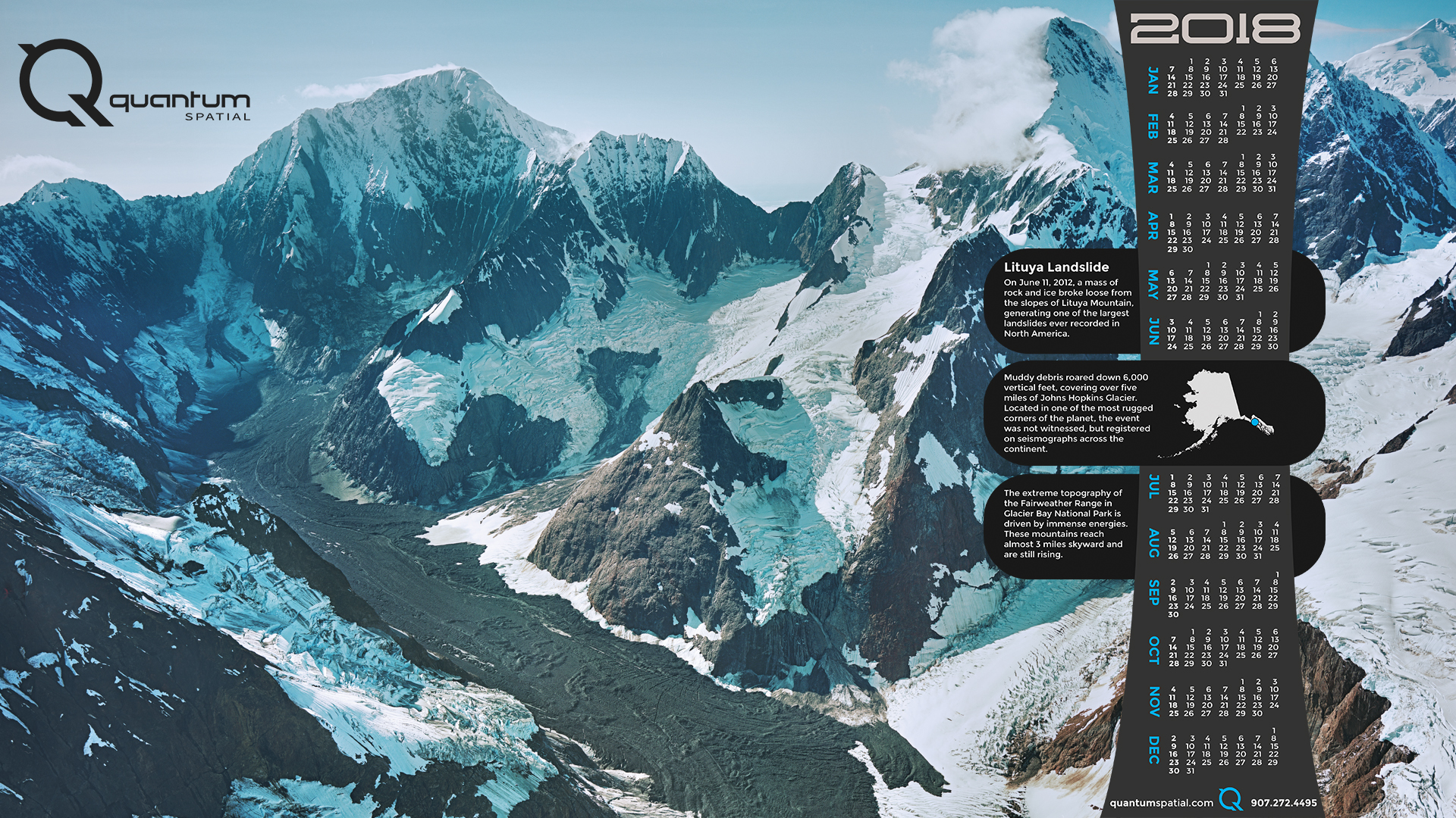 The New Year is right around the corner, which means the Quantum Spatial 2018 calendar is here! We have a downloadable desktop calendar that captures an incredible view of Alaska’s Lituya Landslide. There are two different image sizes to accommodate variation in screen dimensions. Click on the image to begin download. Enjoy, and Happy New Year from everyone at Quantum Spatial!