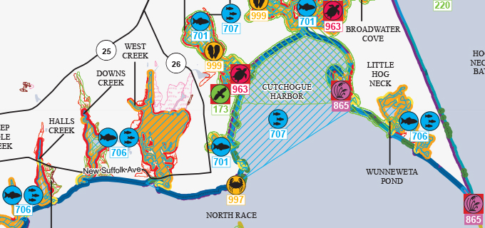 Portion of an ESI map atlas depicting sensitive habitat areas and presence of vulnerable wildlife.