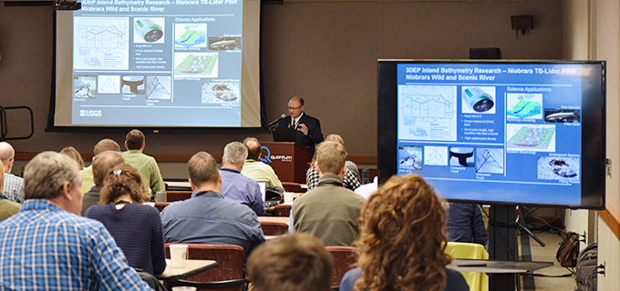 Jeff Danielson, CoNED Applications Project Chief with USGS Earth Resources Observation & Science Center, presenting goals of the Niobrara River topobathymetric lidar pilot study