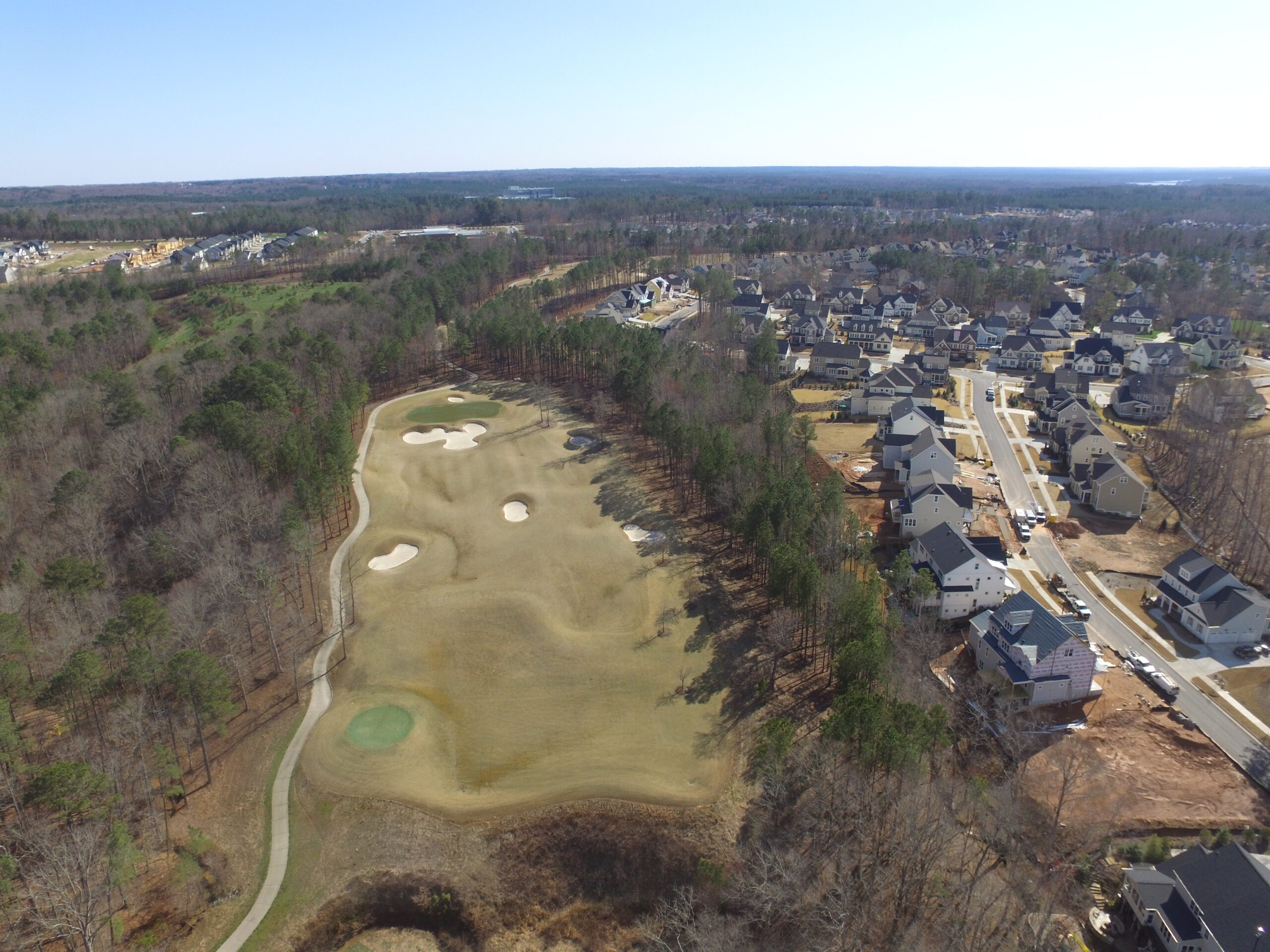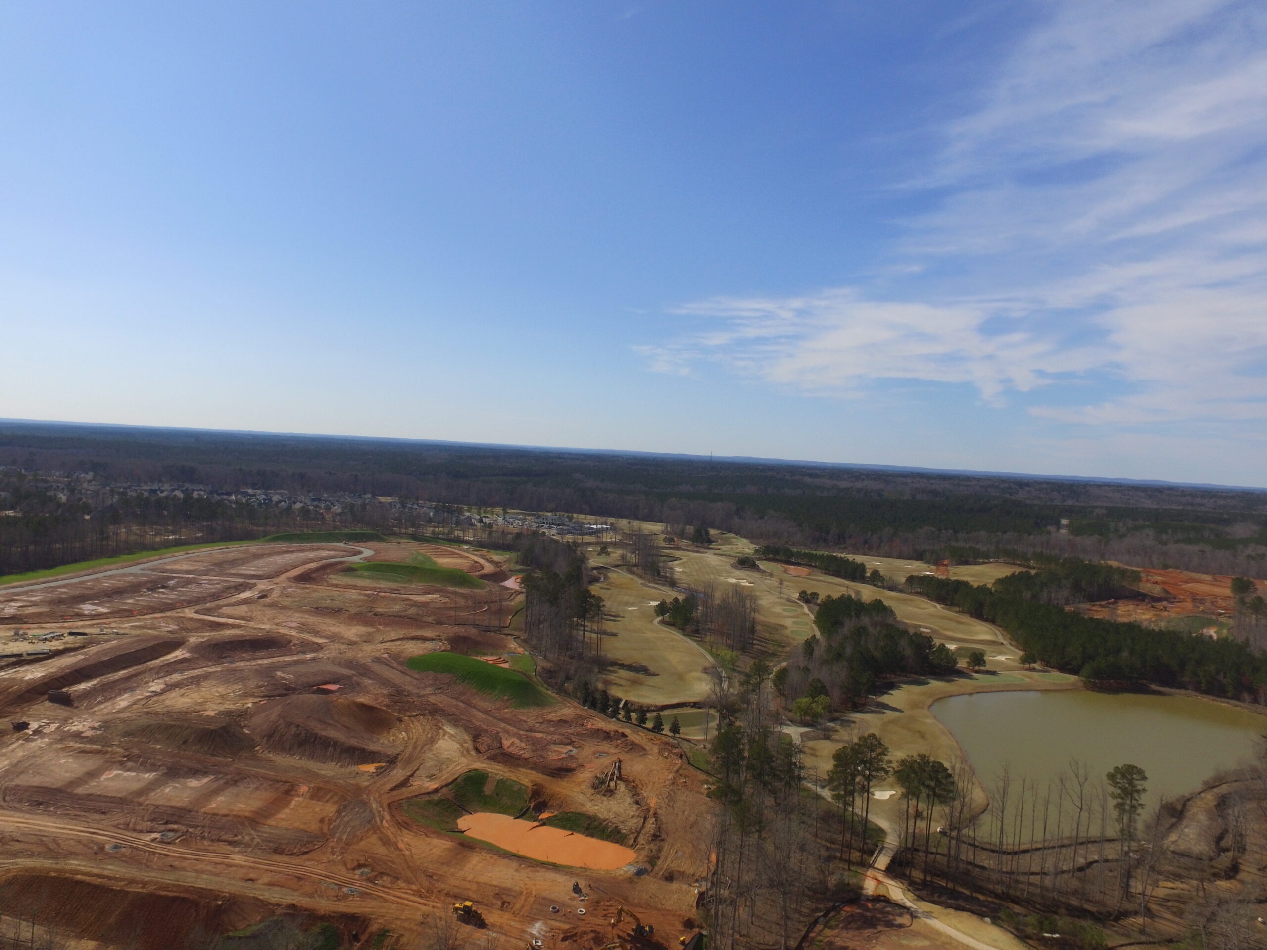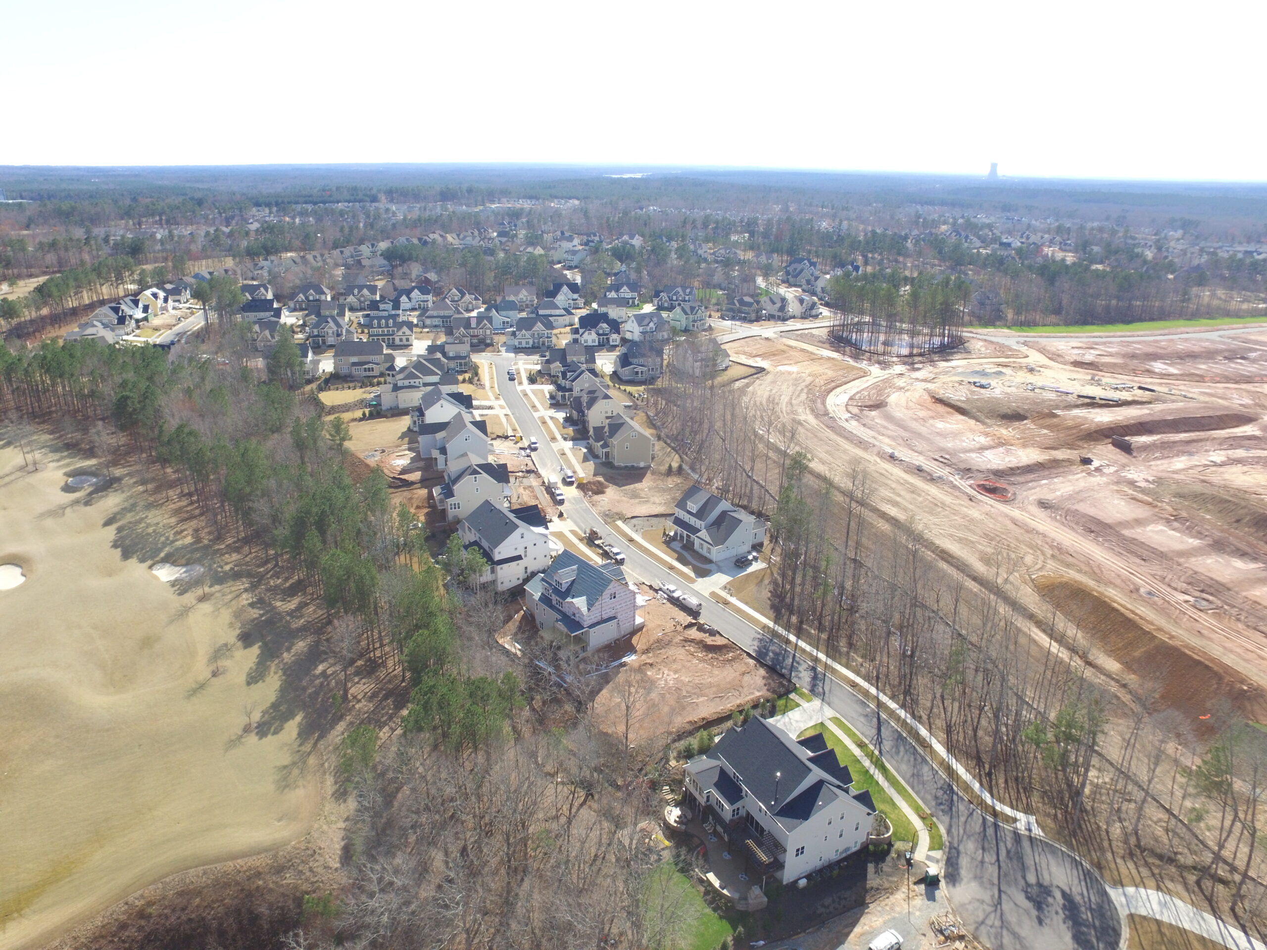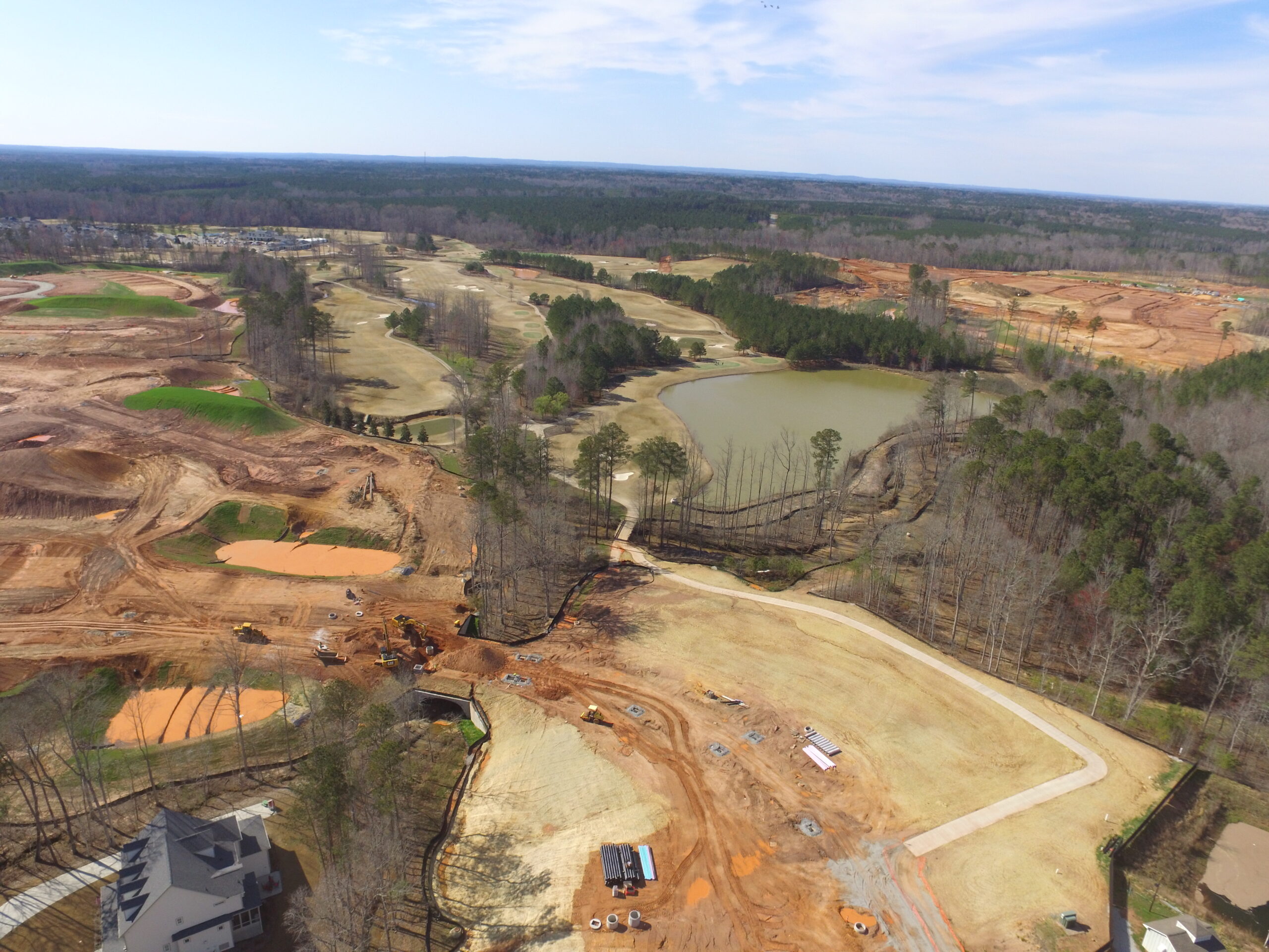 Development of this 800+ acre premier golf course community in Holly Springs, North Carolina began in 2006, and NV5 has provided geotechnical engineering and testing services since its inception.  Subdivision approval required the construction of Green Oaks Parkway (a 1.5 mile, four-lane divided highway) to access the site, and NV5 performed soils testing services for this road, including the development of soil-cement mixtures to help manage the presence of expansive clay soils.  Through numerous phases of construction, we have performed subsurface investigations and geotechnical engineering evaluations, helping the civil designers with estimates of rock excavation quantities and providing recommendations for managing soft soils, expansive clays, and other conditions that have come up as part of developing such a large tract of land.  We have also provided pavement designs and full-time construction materials testing services during development to comply with the Town of Holly Springs stringent requirements for roadway construction in the Triassic Basin geologic region to facilitate acceptance of the streets by the Town for maintenance.  Our testing services have included soils testing for fill placement in roadways and building lots, concrete testing for curb and gutter, and testing of asphaltic concrete.  We have also performed Phase I environmental site assessments at the property for the original developers, as well as for home builders that have purchased lots in the subdivision, as well as foundation examinations for several home builders that are constructing homes in the subdivision.