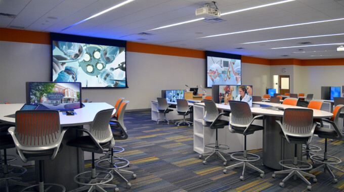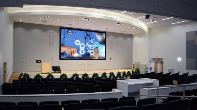 Building Two features the Home Care Apartment, equipped with video and audio capture for students to perform patient care in a simulated environment. In rooms such as the Ultrasound, Respiratory, and the Clinical Skills Labs, students practice what they have learned on high-fidelity manikins. Ultrasound labs use live patients, and the spaces are HIPPA compliant. The Operating Room, X-Ray / Nuclear Medicine Room, and Patient Rooms support actors / simulation manikins, and simulation rooms feature pan-tilt-zoom cameras.