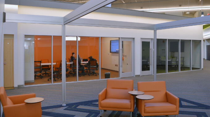 Building One includes conference rooms, a boardroom, presidential office, and a multipurpose room. Rooms are equipped with audiovisual presentation systems and videoconferencing capabilities. The second building houses the learning commons, student organization suite, and study rooms for technology-based group discussion with flat panel displays. Conference rooms function as collaboration spaces featuring a front projection system for presentation practice and instructor lecture recording.