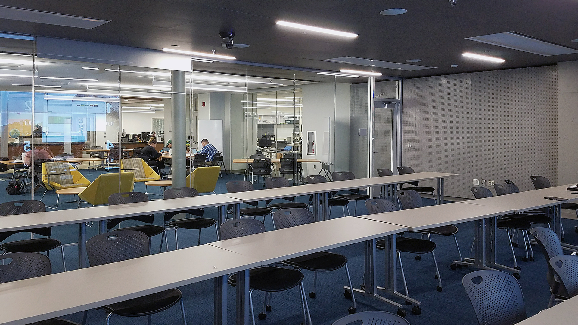 Strategically-designed systems also allow relatively non-expert users to display their data without relying on dedicated staff, while enabling specific operator-controlled visualization research. Study areas feature rolling white boards to promote collaboration and interaction. The building also has a courtyard, and the commons area boasts the whimsically named coffee shop, “Elements Ca-Fé.”