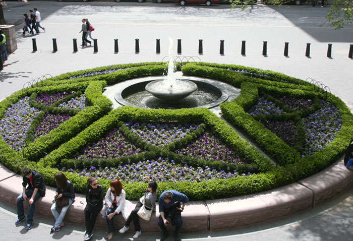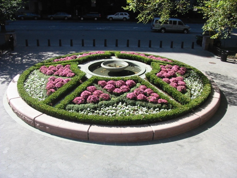 Reconstruction of the surrounding plaza space also included new asphalt block paving and benches, lighting, fencing, and planting beds laid out around the perimeter of the space.