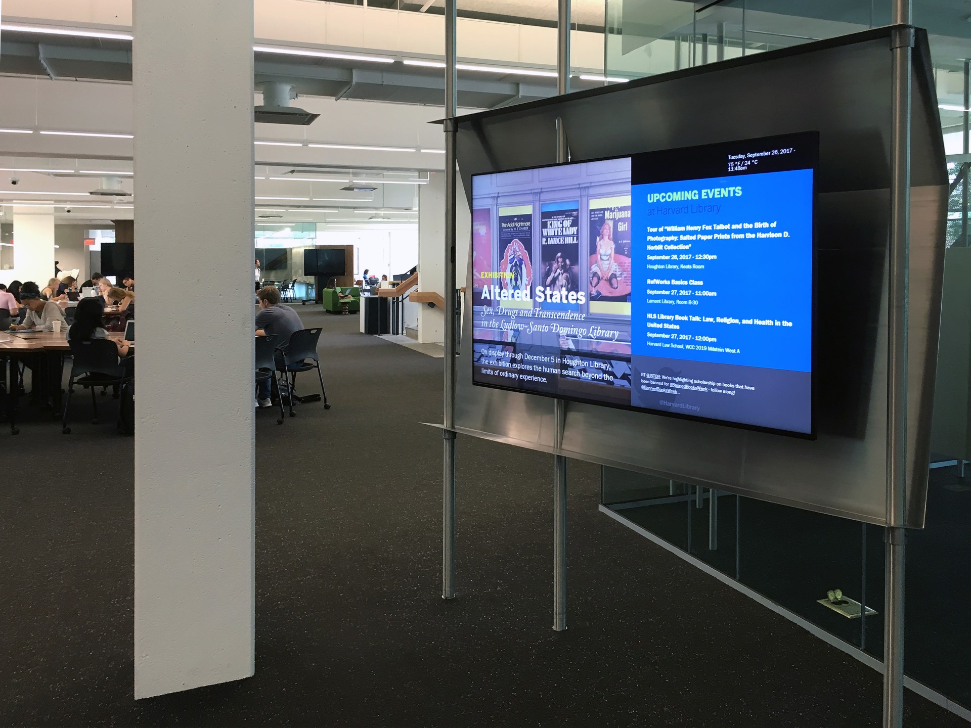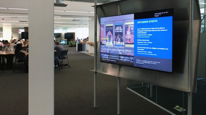 A Digital Directory on each floor presents up-to-date campus info and event happenings. At the Discovery Bar, one-on-one discussions, small group gatherings and demonstrations of new library technology can occur.  The bar also has modular seating that is reconfigurable which provides for a variety of set-up arrangements depending on the event. For larger groups, a motorized projection system is used.