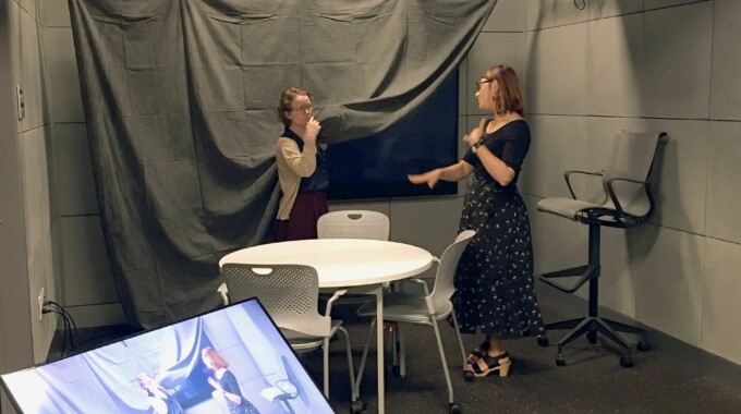 The Library also features two cutting-edge spaces where students and faculty can create and record presentations, interviews, and class assignments. These media studios feature a “one button system” that places emphasis on simplicity for both users and support staff, even when users have no prior video experience. The production workflow is condensed to plugging in a USB drive and pressing one button. The system also contains all audio, video, lighting, computing, and control components.