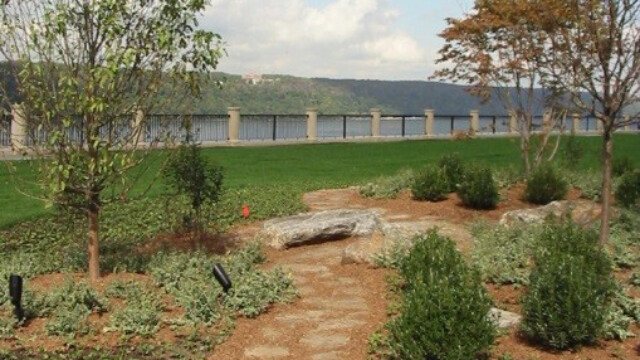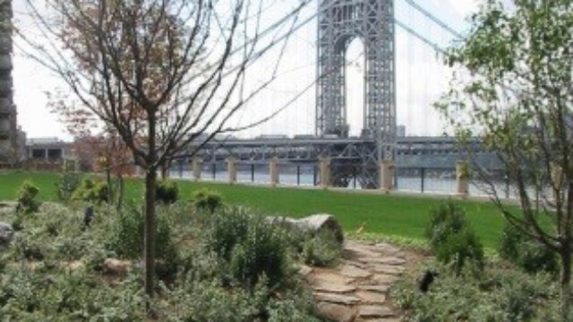 The design includes sweeping lawns, walkways, trees, plantings, rock gardens, benches, lighting, a pergola, and a playground — all arranged around the perimeter to avoid obstructing panoramic views of the George Washington Bridge, Hudson River, and the Palisades cliffs.