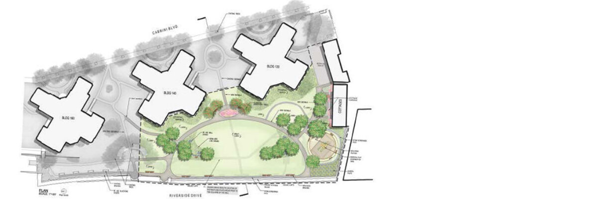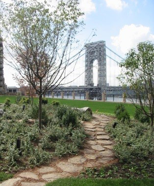 The design includes sweeping lawns, walkways, trees, plantings, rock gardens, benches, lighting, a pergola, and a playground — all arranged around the perimeter to avoid obstructing panoramic views of the George Washington Bridge, Hudson River, and the Palisades cliffs.