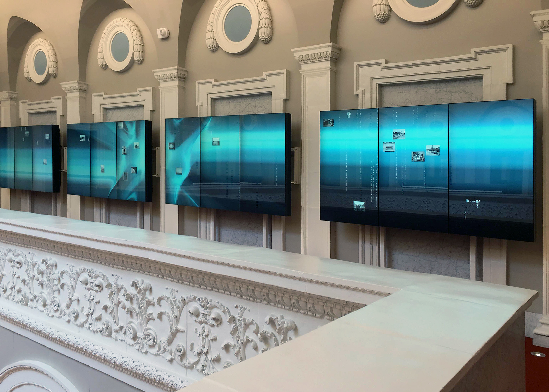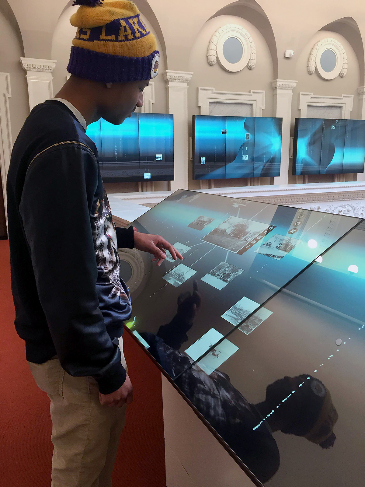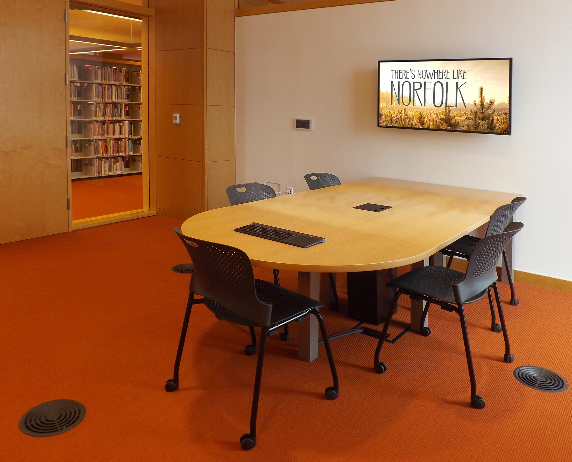 Project highlights include: (1) The Word Wall, a large display configuration spanning from the Forum up through the library staircase, combining technologies including an electronic mesh fabric and high-resolution flat panel displays. This digital “curtain” is capable of displaying letters, words and pictures pertinent to library activities or events, providing a backdrop of luminescence that will be seen from almost anywhere in the Forum. (2) The Cortile area, a cutting edge space showcasing interactive displays throughout. The library is host to a significant photographic archive, and making that photographic archive publicly available was one of the key considerations Content consists of a digitization of the Sargeant Memorial Collection of historical Norfolk articles, items and artifacts. (3) A multiuser, interactive display table in the forum displays happenings in the library and other city related information. This 12’ x 4’ assembled display with a touch sensitive surface allows many windows to be open at once. All the windows can be resized, and patrons can browse the entire collection with their fingers, much like a giant iPad. (4) Wall mounted interactive displays and static holographic displays located throughout the library.