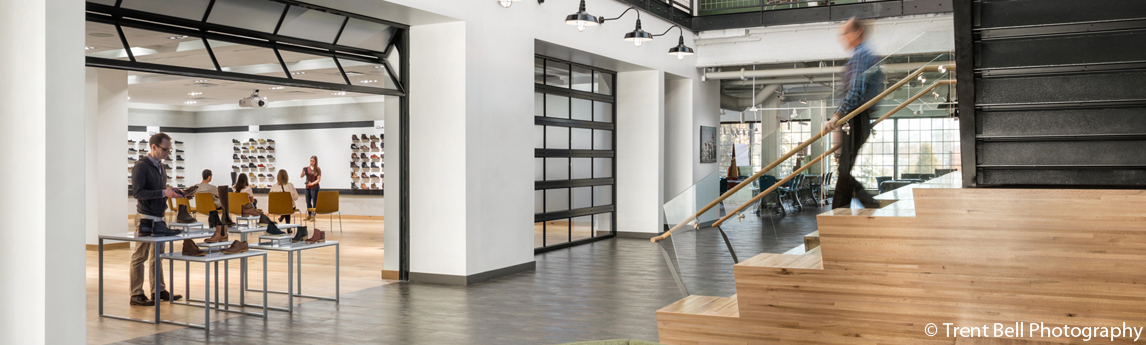 Footwear maker C&J Clark America relocated its operations from Newton Lower Falls to the former Polaroid building in Waltham. NV5 provided MEP, telecommunications, audio visual, and security design for the tenant fit-out of 120,000 SF for the new headquarters. In addition to interior upgrades, the exterior also was completely redone. Exterior improvements included new high-efficiency windows, roof window monitors to bring light into the large interior space, and a new three-story atrium entrance. The four-story facility houses numerous shoe function areas such as showrooms, workshops, design and marketing, retail, and wholesale business support functions. It also includes mostly perimeter-open offices and enclosed interior offices to maximize daylight, a fitness center, cafeteria, and data center.