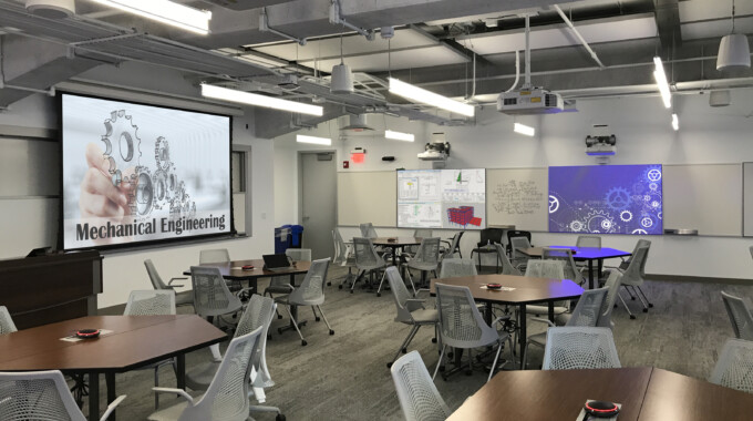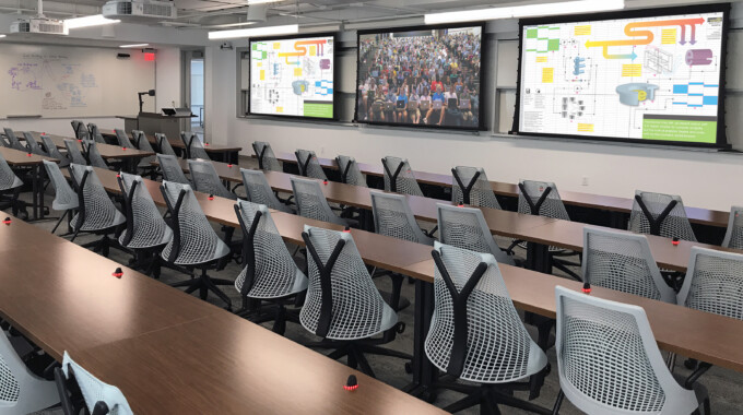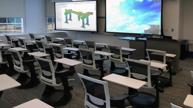 The building is equipped to support both traditional lecture and small group collaborative learning with classrooms of various sizes. The rooms include reconfigurable furniture, an audiovisual system that supports multiple viewing orientations, lecture capture, and multimedia presentation capabilities. Other spaces highlighting the facility are a multipurpose conference room, multiple conference rooms, meeting and group study rooms, and an Experiential Learning Lab providing space for students to develop and utilize new technology.