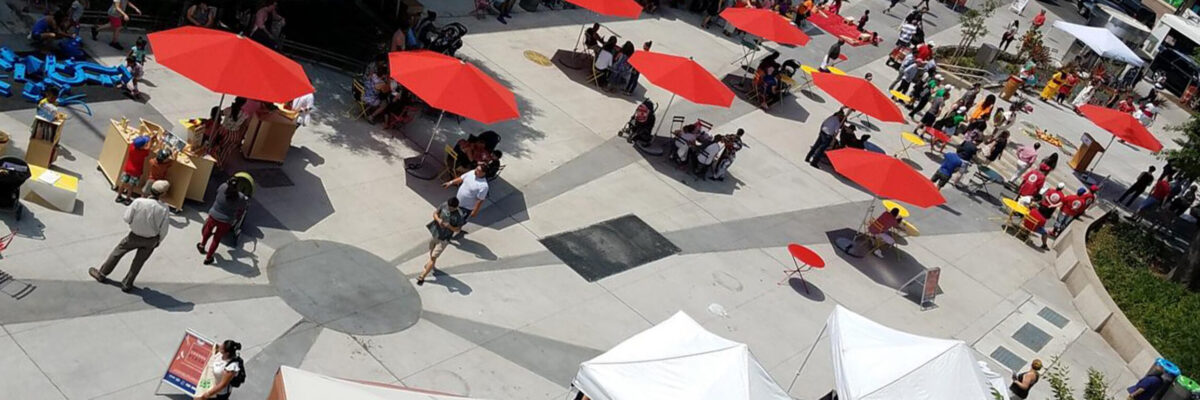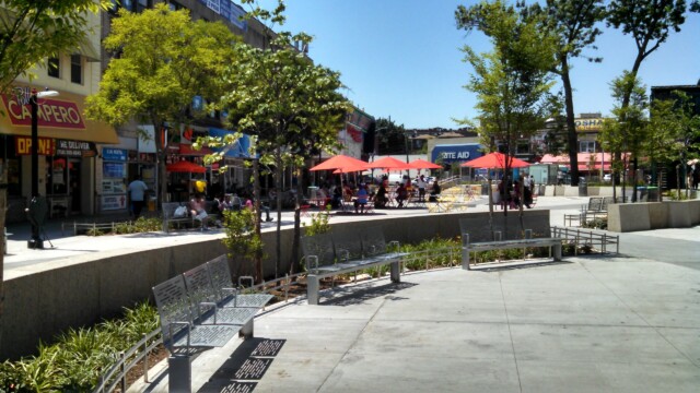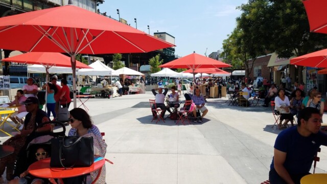 The design defined several distinct spaces that can be used simultaneously for quiet seating, entertainment, and farmers markets. Large planters filled with trees and flowering shrubs and seat walls are combined with fixed and moveable seating, a newsstand, public toilets, a concession stand, and an information kiosk to activate the space.