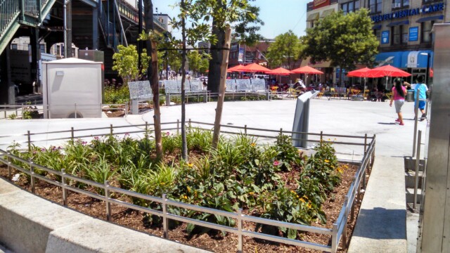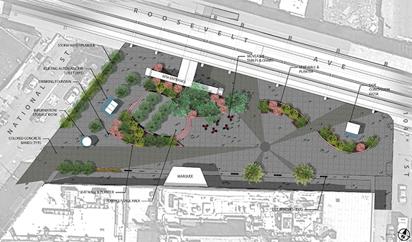 NV5 designed a new urban plaza located directly adjacent to the 104th Street station on the Number 7 subway line (Roosevelt Avenue) in Queens, New York. This project closed a one block long section of street to connect the plaza with the adjacent sidewalk and the stores that front it.