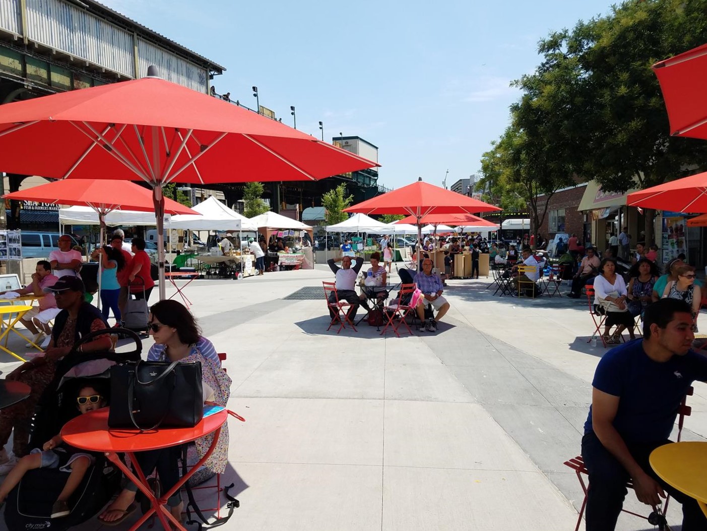 The design defined several distinct spaces that can be used simultaneously for quiet seating, entertainment, and farmers markets. Large planters filled with trees and flowering shrubs and seat walls are combined with fixed and moveable seating, a newsstand, public toilets, a concession stand, and an information kiosk to activate the space.