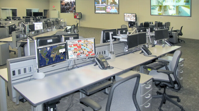 A centerpiece to the design is the role of iPad-based control as envisioned by NV5. Five mobile tablets devices, operating on the building’s secured Wi-Fi network, allow the EOC to control the majority of its systems with a graphically intuitive user control system interface. The tablet not only controls all audiovisual components and displays throughout the EOC, but also provides the staff with complete control of the new system right at their fingertips, allowing them to focus more on making quick emergency response decisions. At the heart of the EOC is the incident management room, the main operations center for the county’s emergency management staff. Designed with flexible seating configurations for approximately 40 people from county and municipal agencies, the room features audiovisual presentation technologies to help meet an array of incident needs. The primary display consists of three wall-mounted front projection screens to accommodate widescreen images from three ceiling-mounted video projectors.