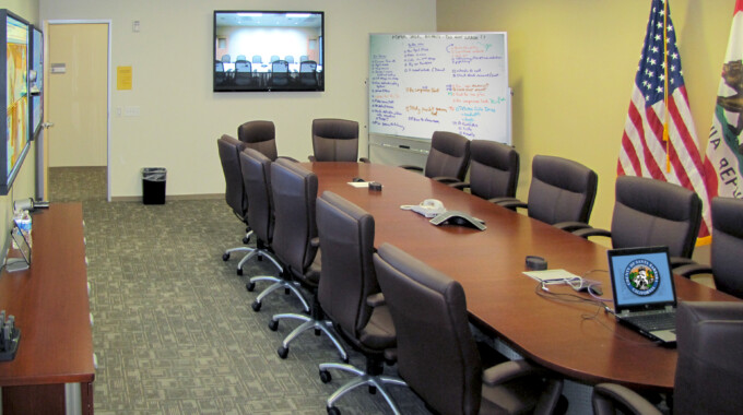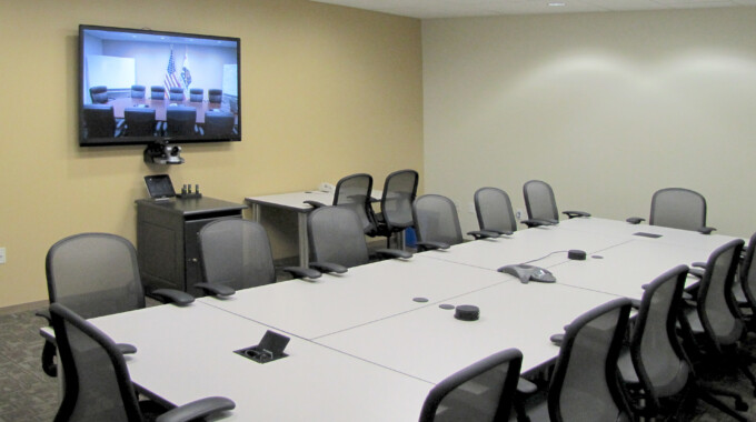 The management conference room and the breakout room each can host up to 16 participants and feature audiovisual systems that accommodate synchronous video conferencing and multimedia presentation. They each feature a 70-inch, wall-mounted flat-panel display for use with presentation materials. The management conference room has two 55-inch wall-mounted flat-panel displays for video conferencing. The joint information center, which acts as the primary public information office, displays the status during an emergency to enable public information officers to distribute critical updates to the general public.