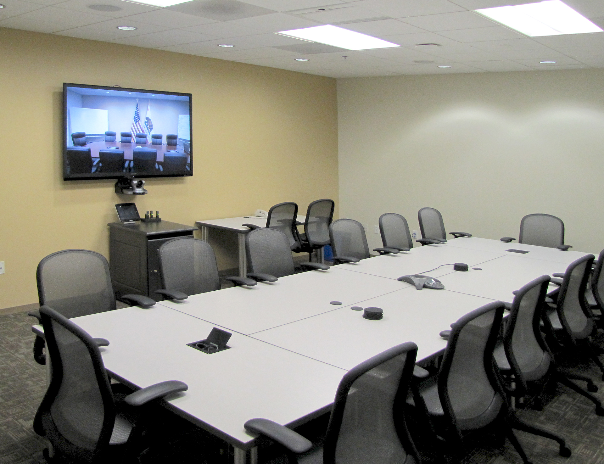 The management conference room and the breakout room each can host up to 16 participants and feature audiovisual systems that accommodate synchronous video conferencing and multimedia presentation. They each feature a 70-inch, wall-mounted flat-panel display for use with presentation materials. The management conference room has two 55-inch wall-mounted flat-panel displays for video conferencing. The joint information center, which acts as the primary public information office, displays the status during an emergency to enable public information officers to distribute critical updates to the general public.