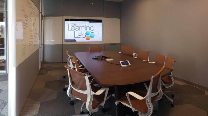 The large group demonstration and small flex rooms provide space for focus groups. Presentation-style AV systems connect to devices for information sharing. Cameras mounted on the screens allow for recording of focus group discussions for archiving purposes. Movable furniture allows for flexible seating arrangements based on the group or product.