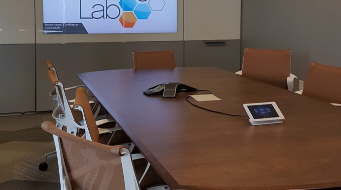 The anteroom, a flexible space for presenting, invites testing groups and individuals into the Customer Usability Center. The space features a presentation-style audiovisual system with a touch sensitive flat screen display, wireless interface, and ceiling-recessed loudspeakers.