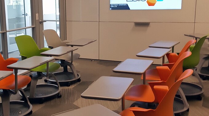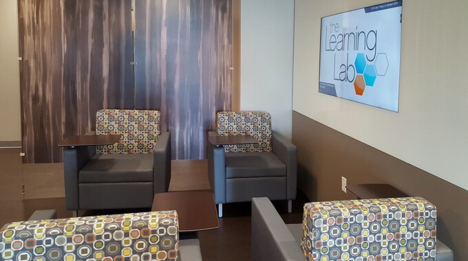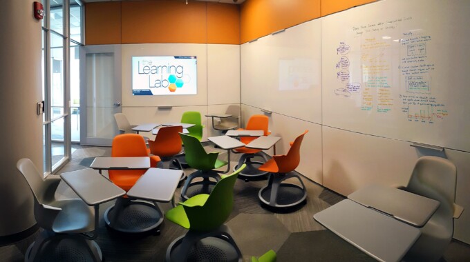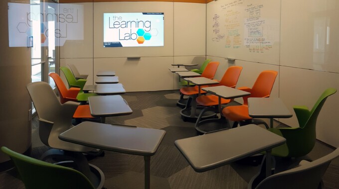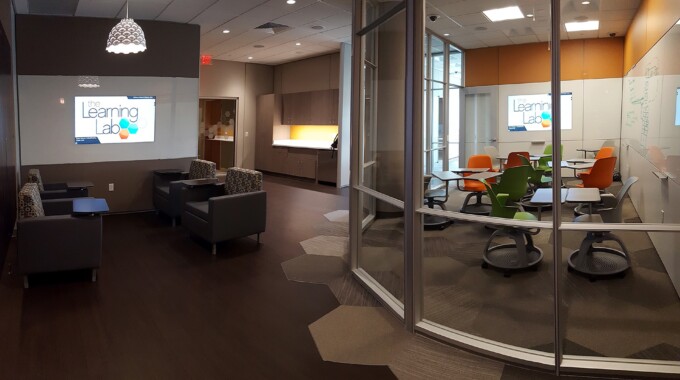 The renovated, technology-rich facility includes a large group demonstration room, small flex spaces, private focus testing area, control/observation room, and flexible foyer.