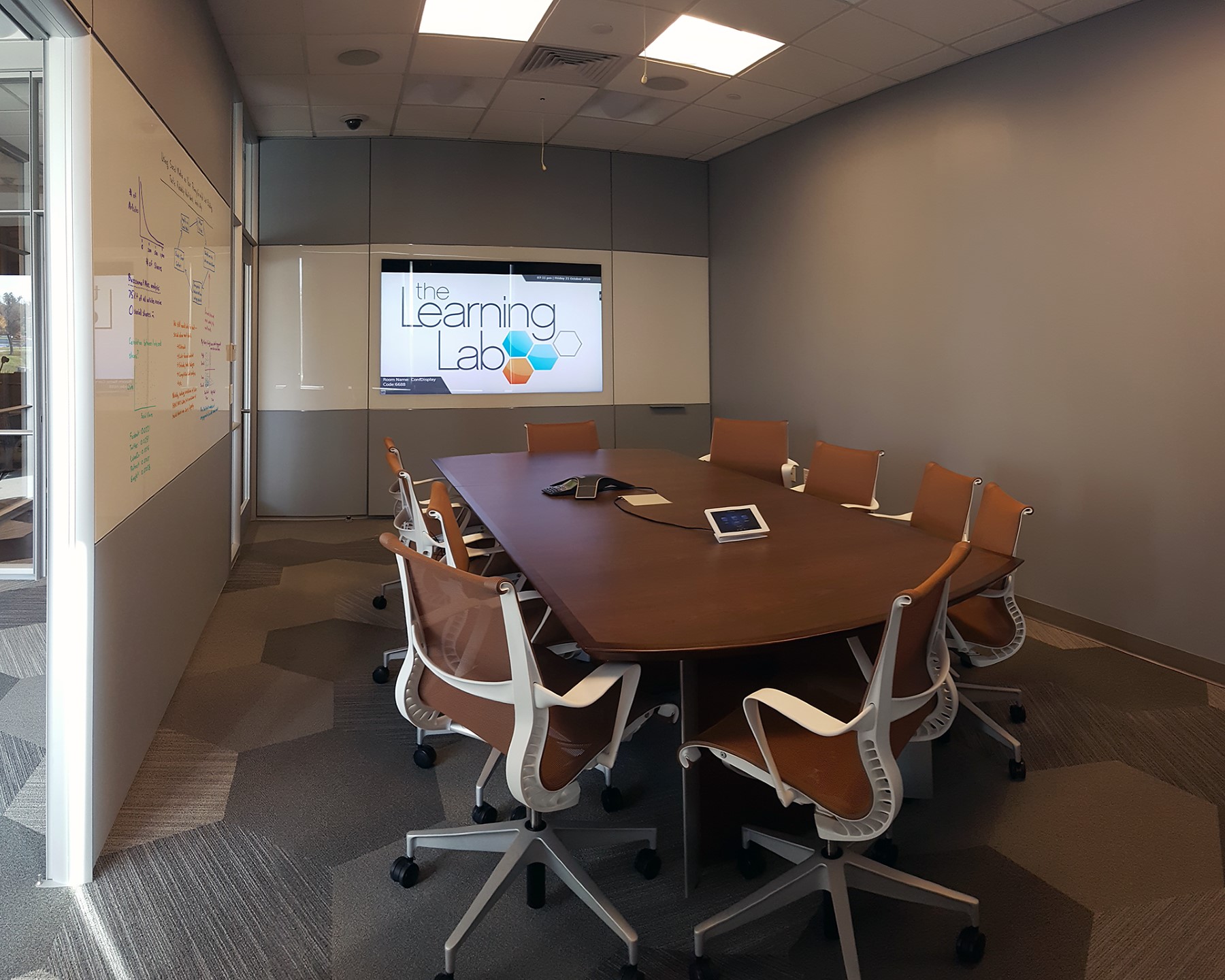 The large group demonstration and small flex rooms provide space for focus groups. Presentation-style AV systems connect to devices for information sharing. Cameras mounted on the screens allow for recording of focus group discussions for archiving purposes. Movable furniture allows for flexible seating arrangements based on the group or product.