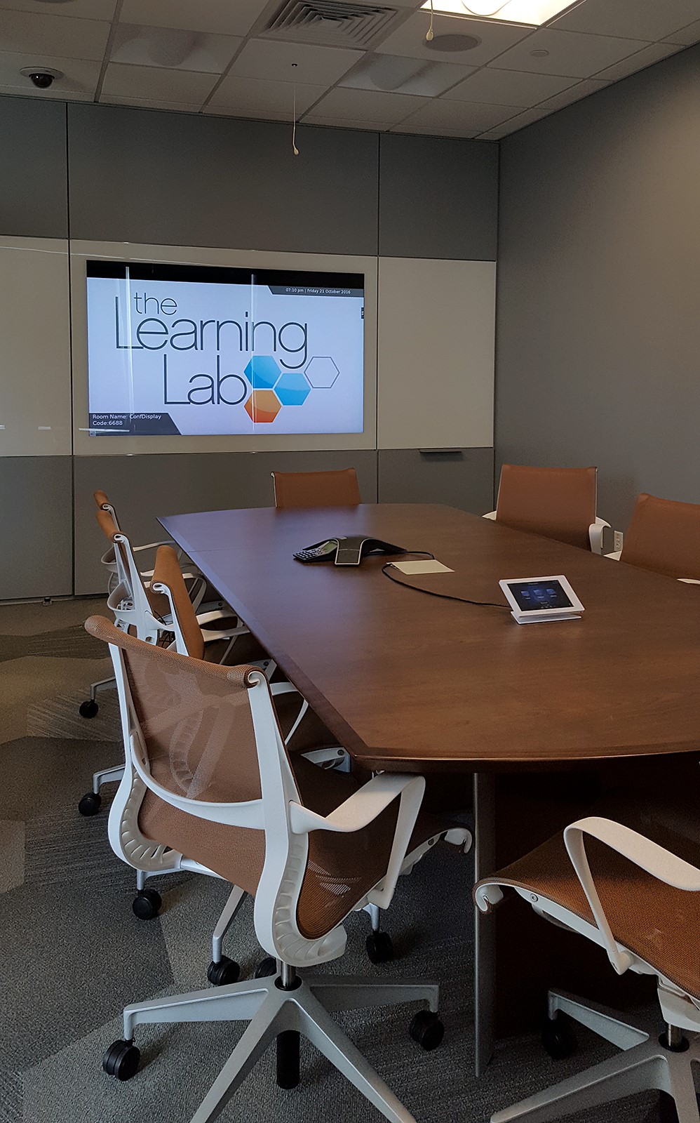 The anteroom, a flexible space for presenting, invites testing groups and individuals into the Customer Usability Center. The space features a presentation-style audiovisual system with a touch sensitive flat screen display, wireless interface, and ceiling-recessed loudspeakers.