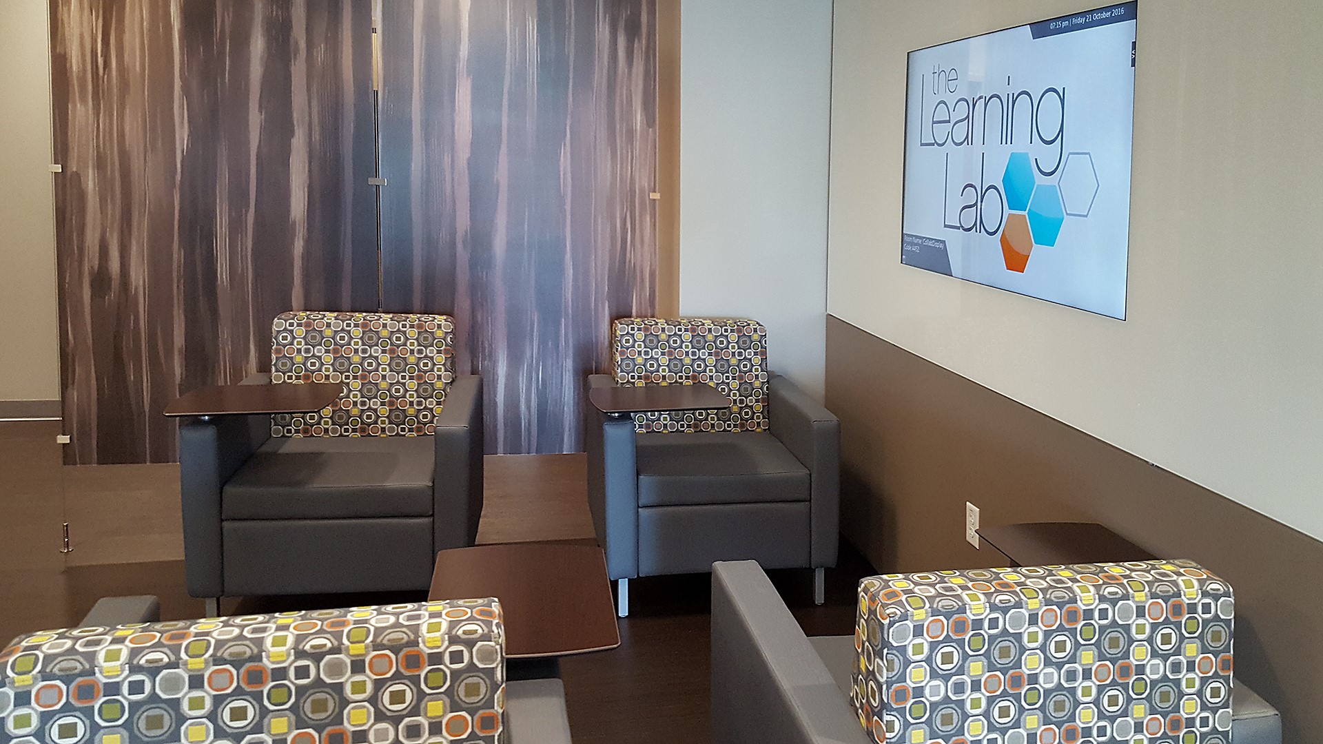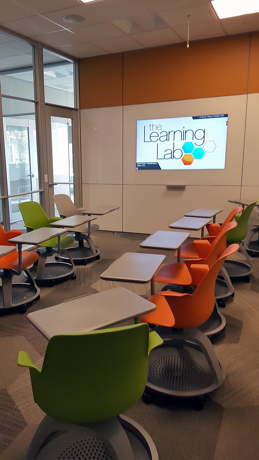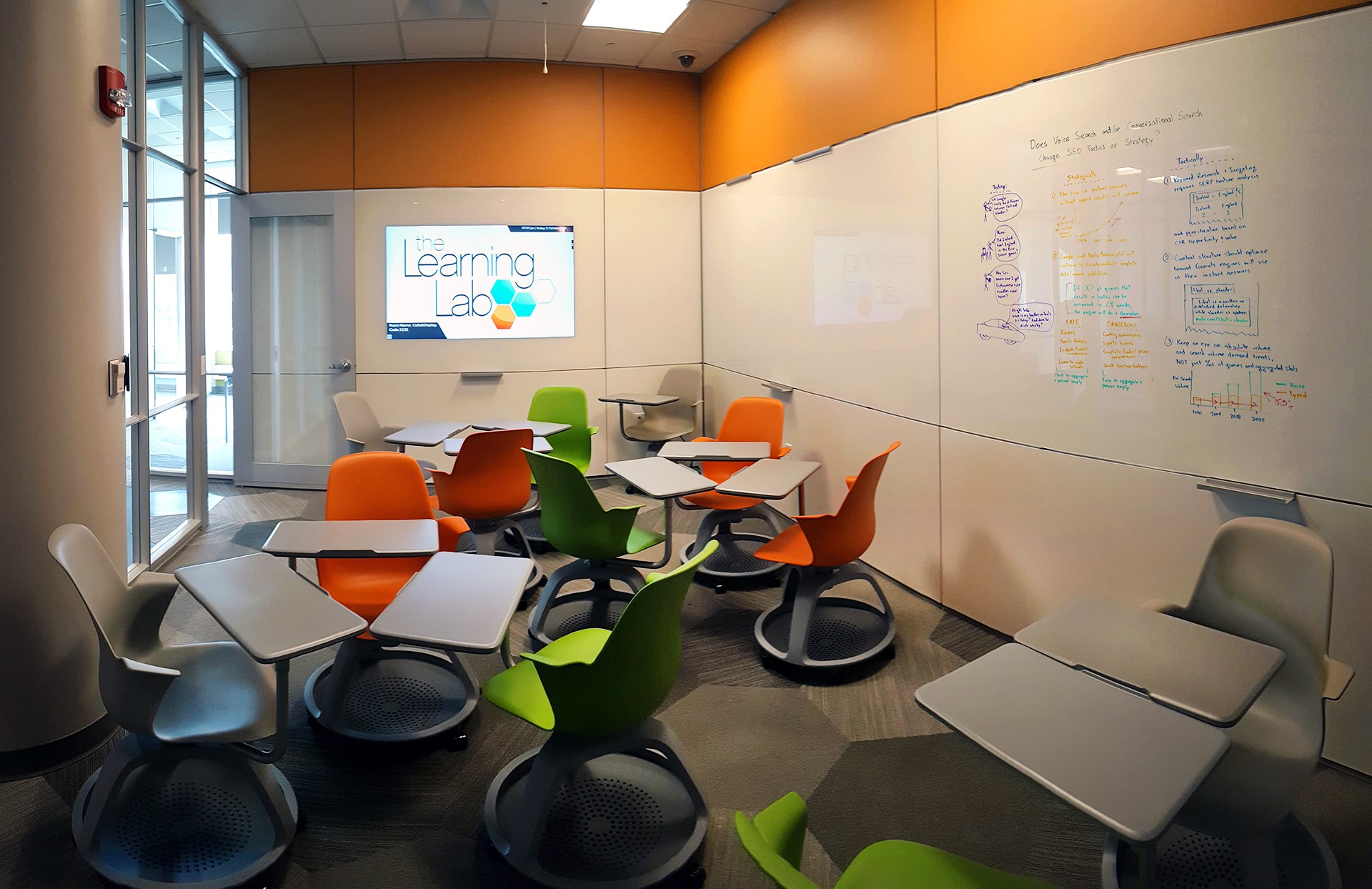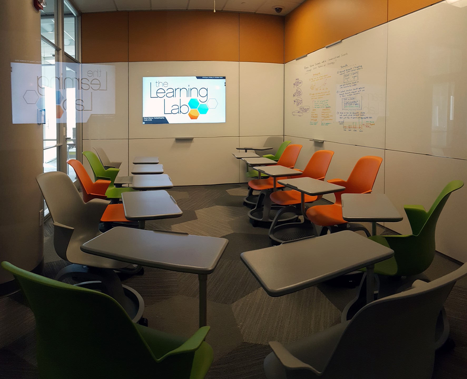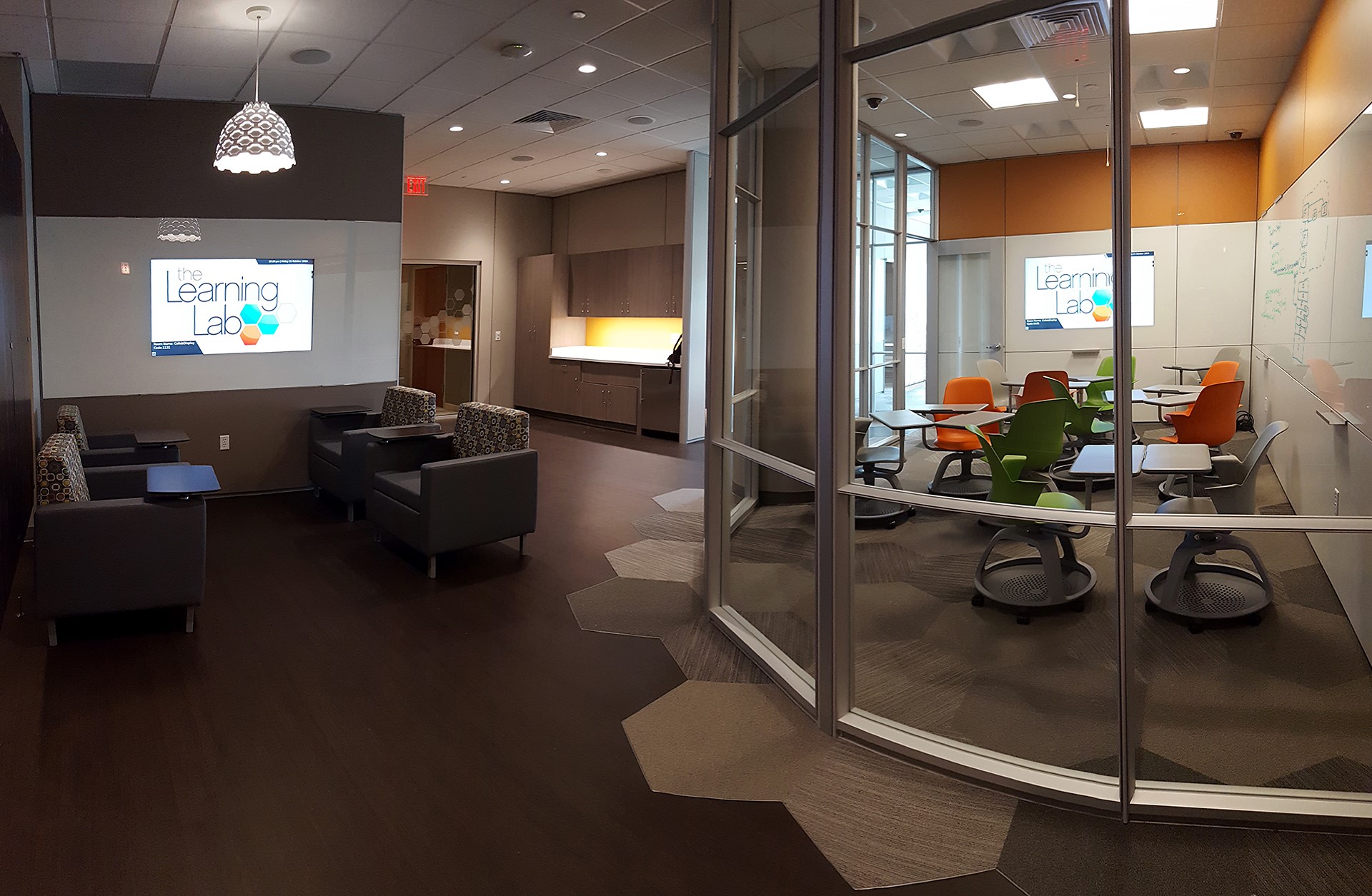 The renovated, technology-rich facility includes a large group demonstration room, small flex spaces, private focus testing area, control/observation room, and flexible foyer.