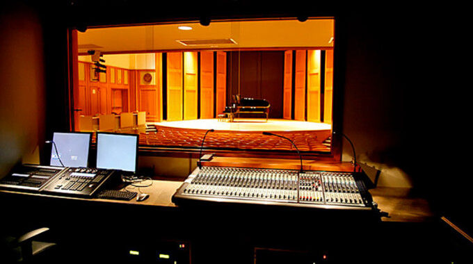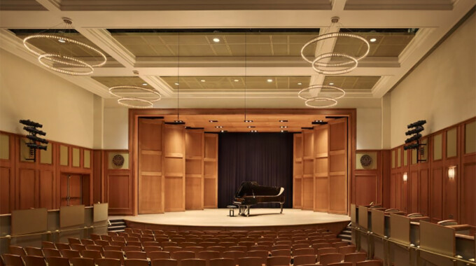 One of the theatres on campus is the new 325-seat Eugene and Shelley Enlow Recital Hall. First a chapel, then a gymnasium, the space is now a spectacular chamber music facility.” An innovative design preserves the intimate nature and original proportions of the room while increasing its vertical volume by 15 feet—allowing for the space needed for quality sound and clarity. This was achieved through the use of a sound-transparent mesh ceiling at the height of the original solid ceiling.