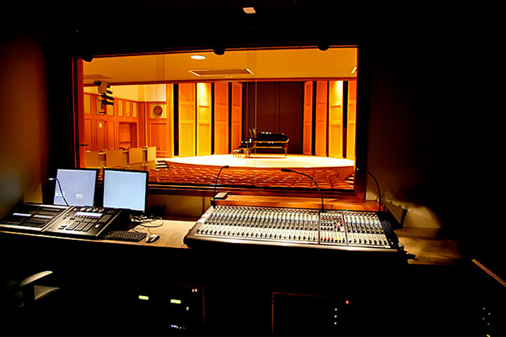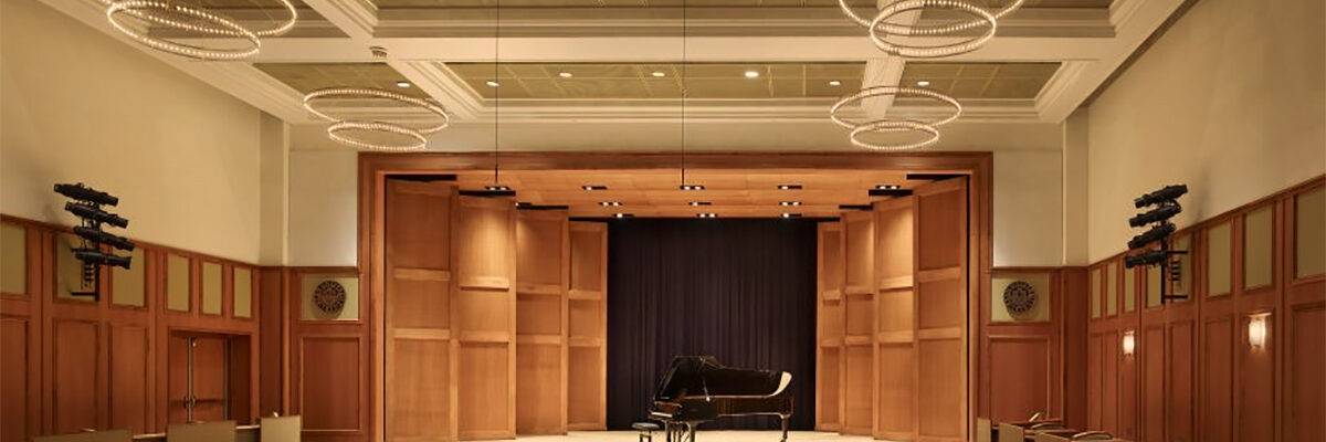One of the theatres on campus is the new 325-seat Eugene and Shelley Enlow Recital Hall. First a chapel, then a gymnasium, the space is now a spectacular chamber music facility.” An innovative design preserves the intimate nature and original proportions of the room while increasing its vertical volume by 15 feet—allowing for the space needed for quality sound and clarity. This was achieved through the use of a sound-transparent mesh ceiling at the height of the original solid ceiling.