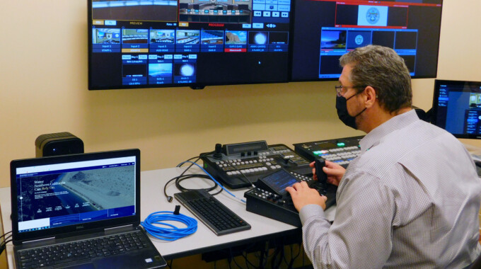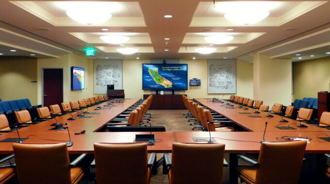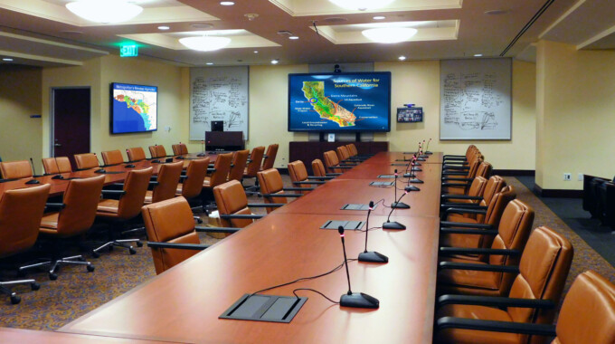 The Boardroom features two large LED video walls flanking the famous MWD medallion logo behind the dais, providing excellent views of meeting materials. Strategically placed remote control cameras provide video capture, and a full-featured control room delivers flexibility with all aspects of audiovisual, sound reinforcement, online recording, and broadcasting for both formal hearing and informal sessions.