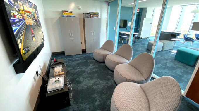 Other technology-rich spaces include a crafts room, banquet room, 24-hour lobby, 30 study rooms, and five board rooms with acoustic clouds on the ceilings to absorb sound and acoustic curtains that block outside noise.