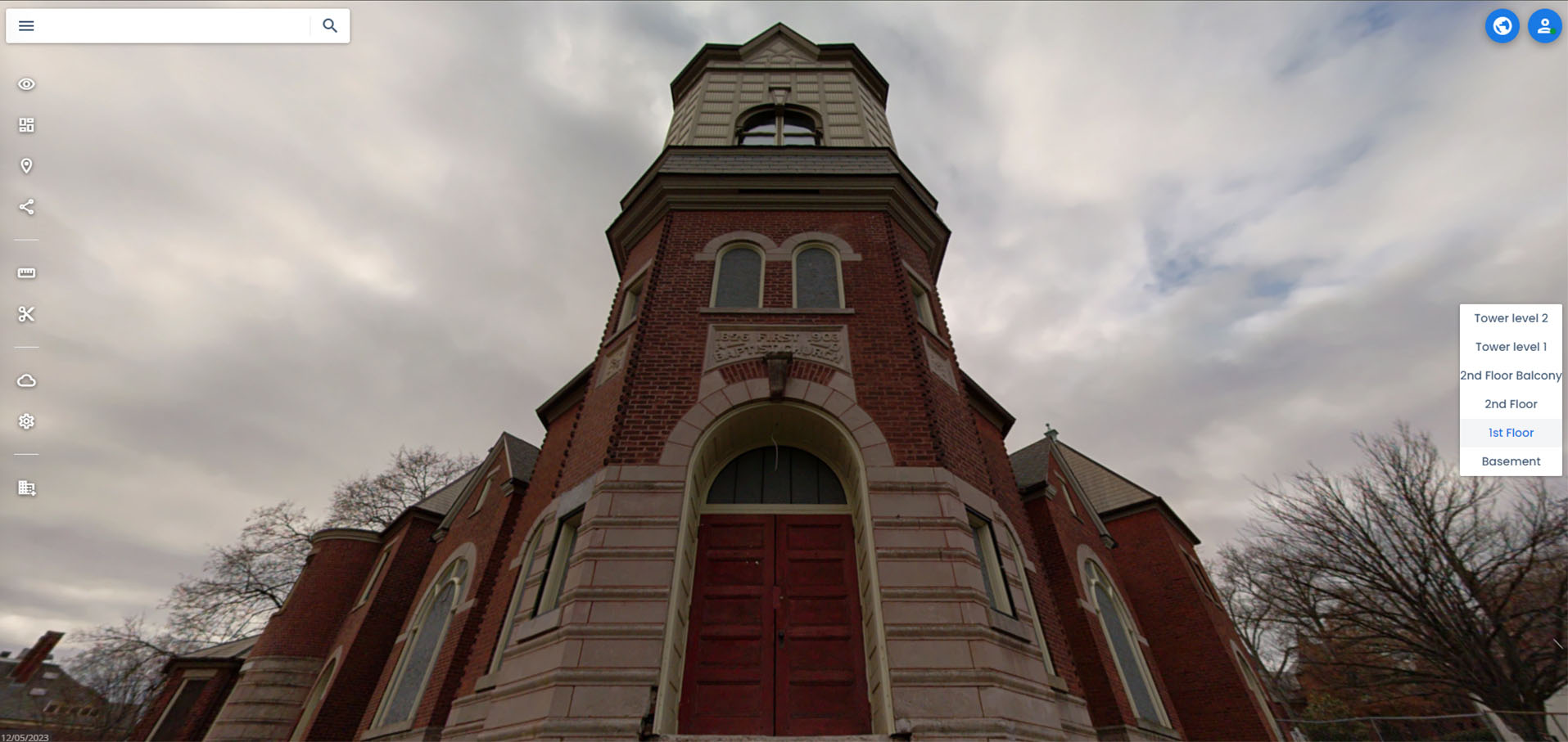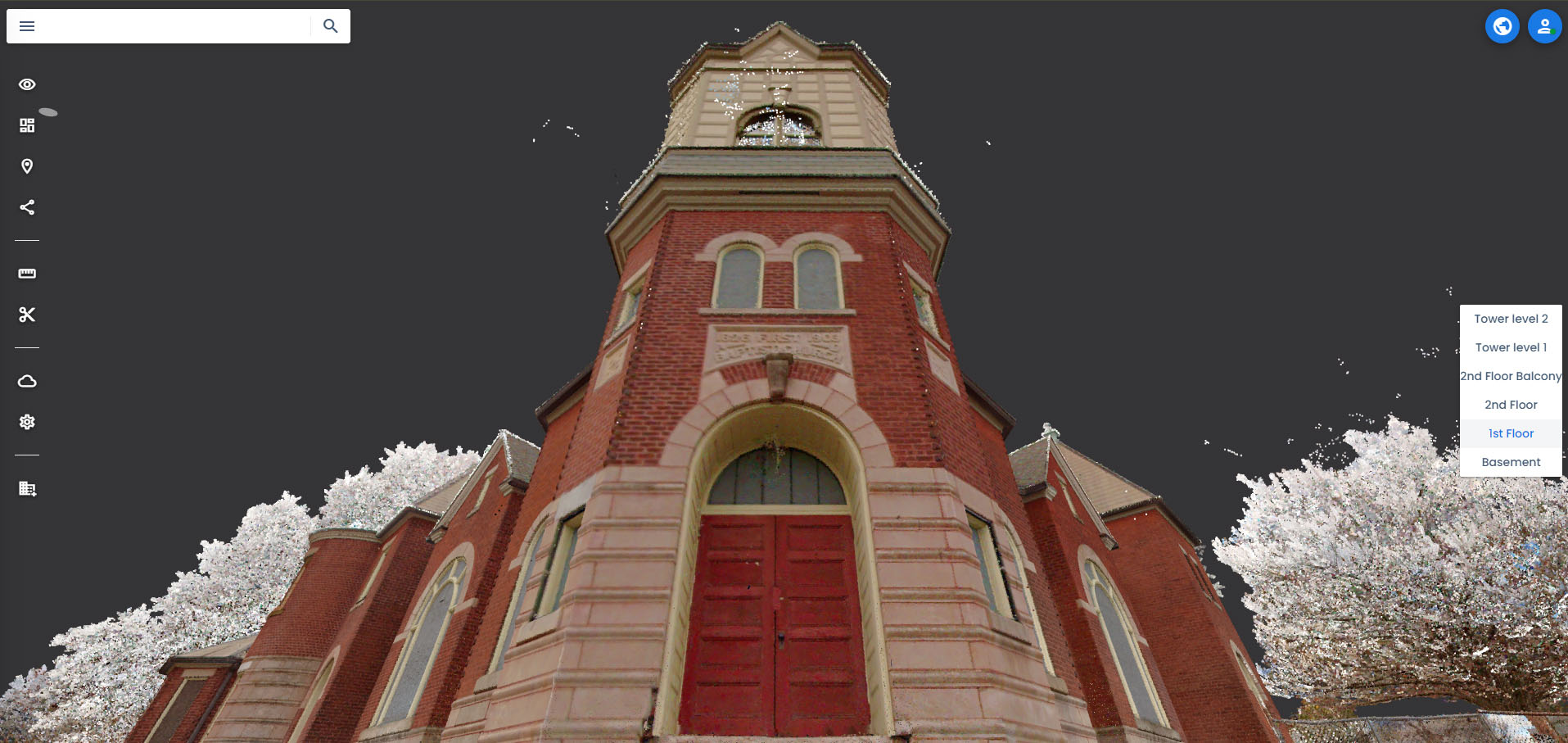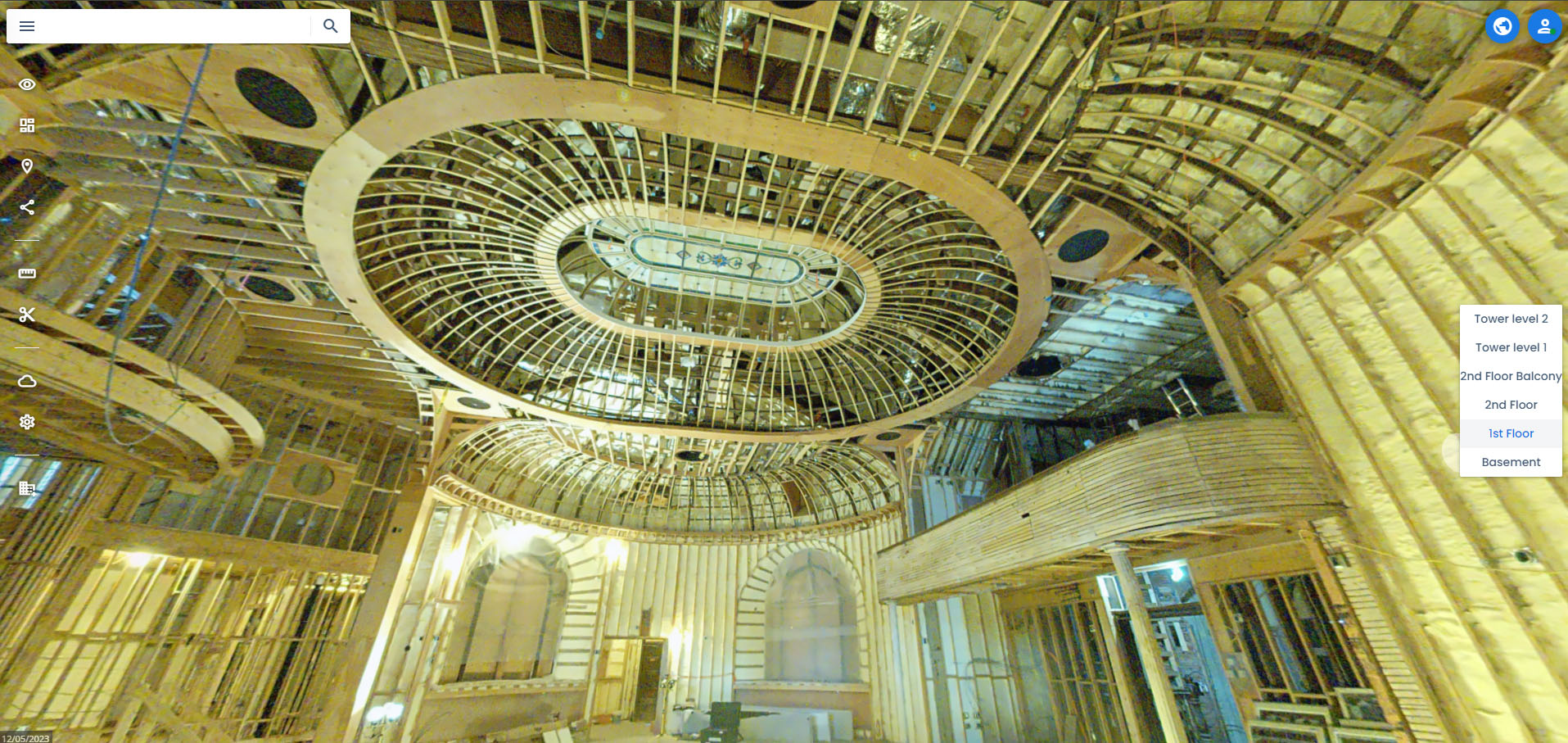 This three-level, 15,000 sf historic structure was scanned using NavVis VLX 3 for interior capture and DJI Mavic 3E for aerial documentation. NV5 performed both interior and exterior scanning, producing a point cloud, virtual tour, and drone imagery to support architectural planning and documentation. The scans were intended to verify existing drawings and provide accurate spatial data for ongoing design and assessment work.